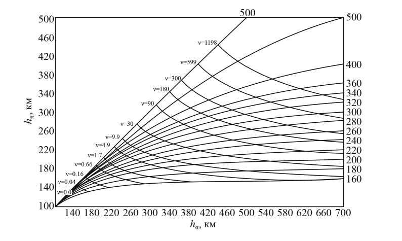 Тогда же Тимур Магометович совместно с Д.Е. Охоцимским и Г.П. Таратыновой выполнил расчет времени существования ИСЗ на орбите с учетом действия на него сопротивления атмосферы Земли. Решение этой задачи пытались аналитически найти многие исследователи в предположении экспоненциальной зависимости плотности атмосферы от высоты. Но на самом деле эта зависимость является куда более сложной. Энеевым, Охоцимским и Таратыновой решение было представлено в виде диаграммы (рис. 2), где по оси абсцисс откладывается апогей, по оси ординат — перигей орбиты спутника, а параметр n пропорционален числу витков орбиты. Зная коэффициент пропорциональности, можно быстро узнать время существования спутника. Диаграмма оказалась очень ценной для проектных расчетов.
