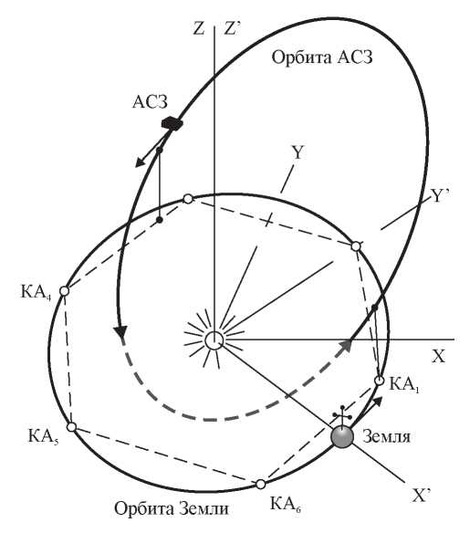 В научной среде было предложено несколько вариантов борьбы с опасными астероидами: от подрыва астероида ракетой с ядерным зарядом, до покраски астероида в белый цвет, чтобы солнечное давление отклонило траекторию астероида. Тимур Магометович не остался в стороне и предложил свою схему космического базирования для определения опасных астероидов. Его идея состояла в том, что на орбиту Земли запускается группировка из нескольких спутников (рис. 7). Каждый спутник имеет собственную оптическую систему наблюдения. Общая область наблюдения, создаваемая телескопами с нескольких космических аппаратов, образует «оптический барьер». Когда барьер пересекается астероидом, происходит обнаружение астероида и определение его орбиты. Расчеты, выполненные Г.Б. Ефимовым, показали, что схема эффективна для группы астероидов Атон (например, Апофис), наблюдение которых с Земли затруднено.