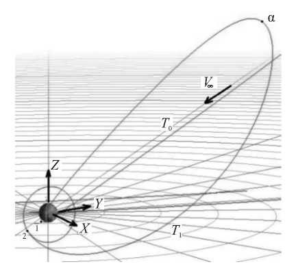 Рис. 2. Номинальная траектория двухимпульсного выведения КА на высокую орбиту ИСЛ, где осями X, Y и Z обозначены оси селенографической системы координат XYZ.