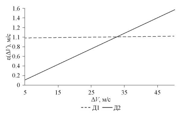 На рис. 3 представлена ошибка выдачи импульса скорости в зависимости от сообщаемого импульса скорости ΔV для двух вариантов двигателей Д1 и Д2. Из его анализа видно, что для импульсов ΔV менее 33.3 м/с выгоднее использовать двигатель Д2 с малой тягой, при бо́льших величинах — двигатель Д1 с большой тягой.