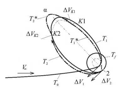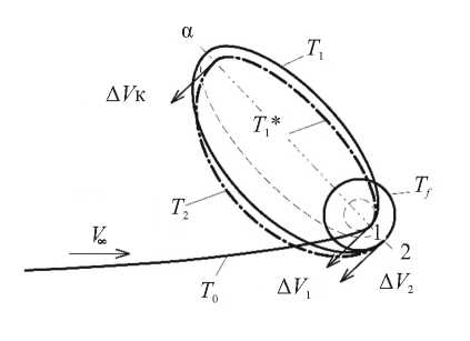 Полагаем, что в таком случае влияние ошибок определения положения и скорости, а также ошибок выдачи импульсов скорости компенсируется добавлением корректирующего импульса скорости ΔVK в наиболее удаленной от Луны точке α, а номинальная двухимпульсная траектория выведения превращается в трехимпульсную. Ее схема приведена на рис. 4. На нем сплошной и штрихпунктирной линиями показаны номинальная траектория и траектория с учетом коррекций соответственно, также V∞ — скорость на «бесконечности» при подлете к Луне; T0 — гипербола подлета к Луне; T1 — номинальная орбита КА после приложения первого основного импульса ΔV1; T1* — участок траектории перелета спутника из периселения π0 (точка 1) в апоселений α с учетом ошибок определения положения и скорости КА, а также ошибок выдачи первого импульса ΔV1; T2 — участок траектории перелета из апоселения α в периселений πf (точка 2) с учетом возмущений, ошибок определения положения и скорости КА, а также ошибок выдачи корректирующего импульса ΔVк; ΔV2 — второй основной импульс скорости.