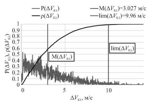 Рис. 7. Зависимости функции распределения вероятности P(ΔVК1) и плотности распределения вероятности ρ(ΔVК1) для первого корректирующего импульса ΔVК1.