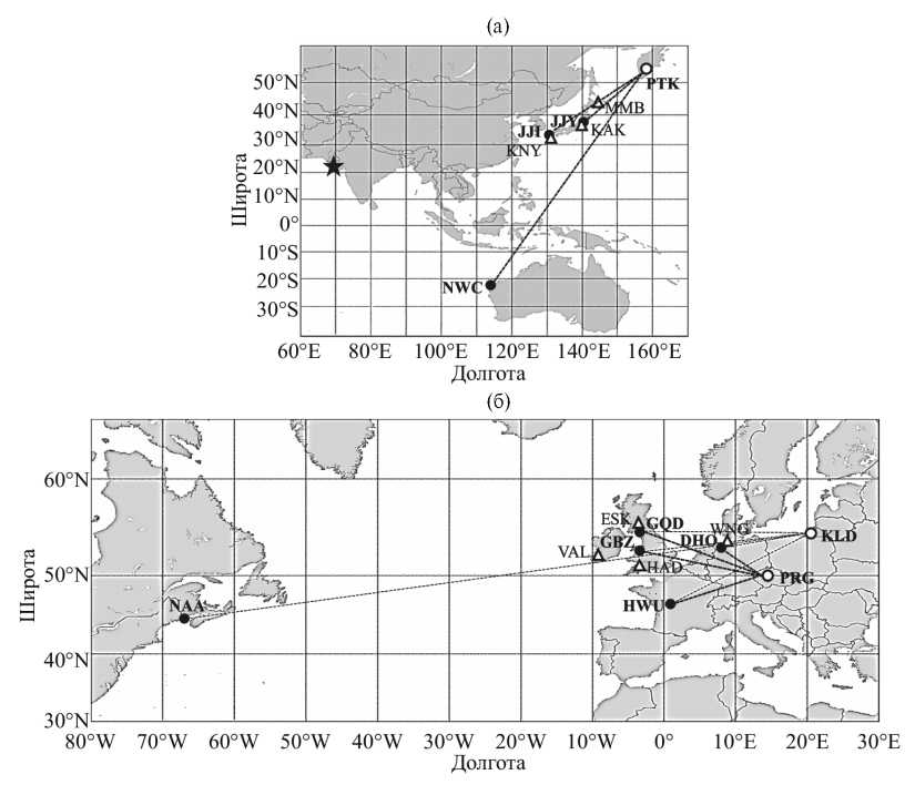Ионосферные наблюдения дополнены односекундными и одноминутными данными магнитометров INTERMAGNET в том же регионе, что и СДВ-радиотрассы. Положение магнитных станций показано на рис. 1.