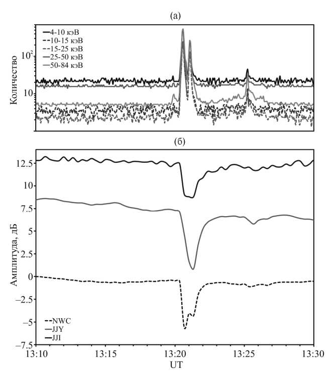 Рис. 2. Вариации гамма-излучения в разных энергетических каналах по данным прибора STIX (а) и вариации амплитуды сигнала, принимаемого в PTK по трассам JJY, JJI и NWC (б).