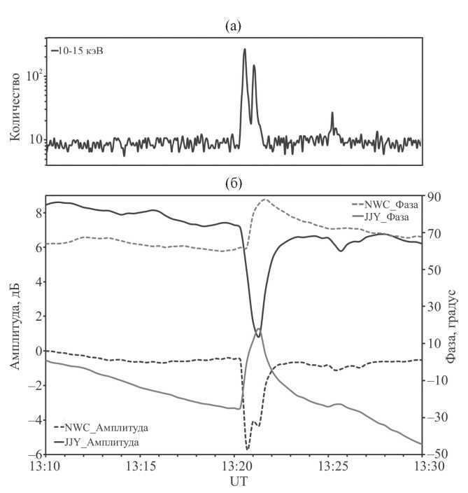 Рис. 3. Вариации гамма-излучения в энергетическом канале 10…15 кэВ по данным прибора STIX (а) и возмущения амплитуды и фазы на радиотрассах JJY и NWC (б).