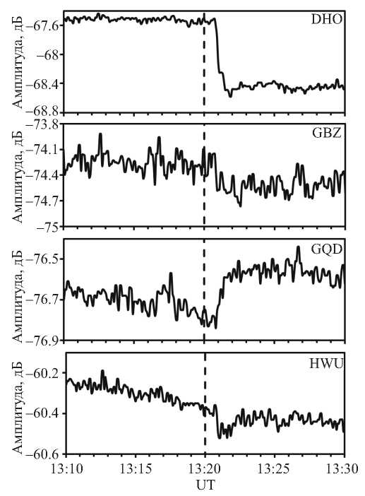 Рис. 4. Вариации амплитуды сигнала, принимаемого в PRG по трассам DHO, GBZ, GQD и HWU. Вертикальный пунктир показывает момент гамма-вспышки.