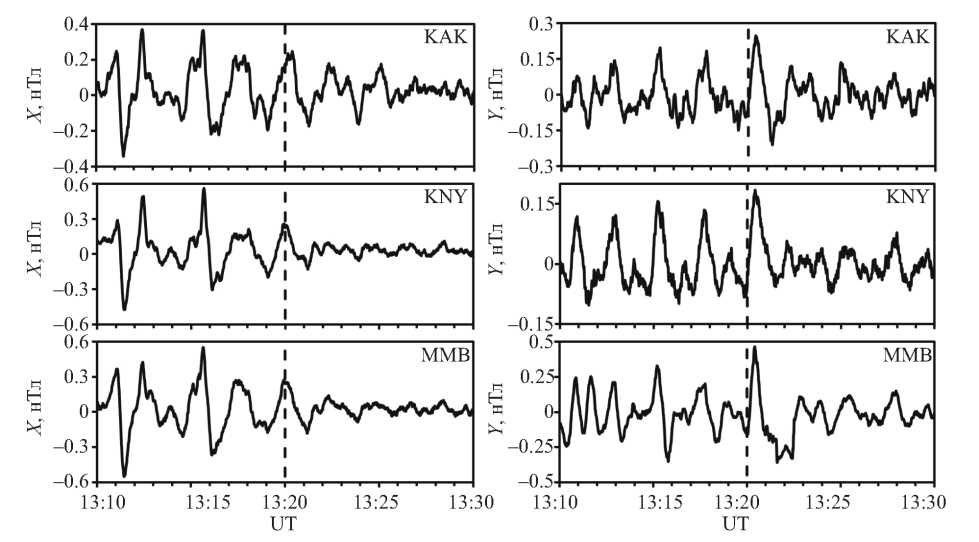 Для поисков геомагнитного отклика на вспышку в ночной полусфере были отобраны данные магнитометров в северном полушарии — MMB, KAK, KNY (рис. 1a). Магнитограммы горизонтальных X-, Y-компонент этих станций с удаленным трендом показаны на рис. 6. Во время гамма-вспышки в ночной полусфере можно отметить лишь появление слабого всплеска геомагнитного поля с амплитудой <0.5 нТл и длительностью ~1…2 мин на уровне фоновых вариаций.