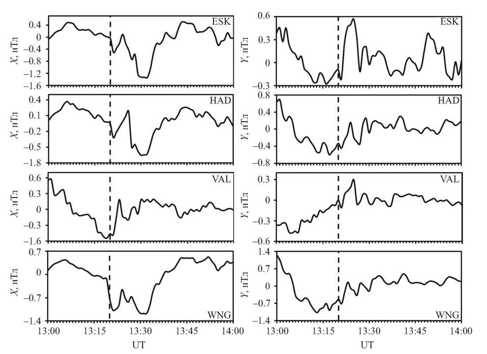 В дневной полусфере на станциях сети INTERMAGNET (ESK, HAD, VAL, WNG — рис. 1б) отчетливо виден уединенный импульс с амплитудой по X-компоненте до ~0.5 нТл, и по Y-компоненте до 0.8 нТл длительностью 5…7 мин (рис. 7).