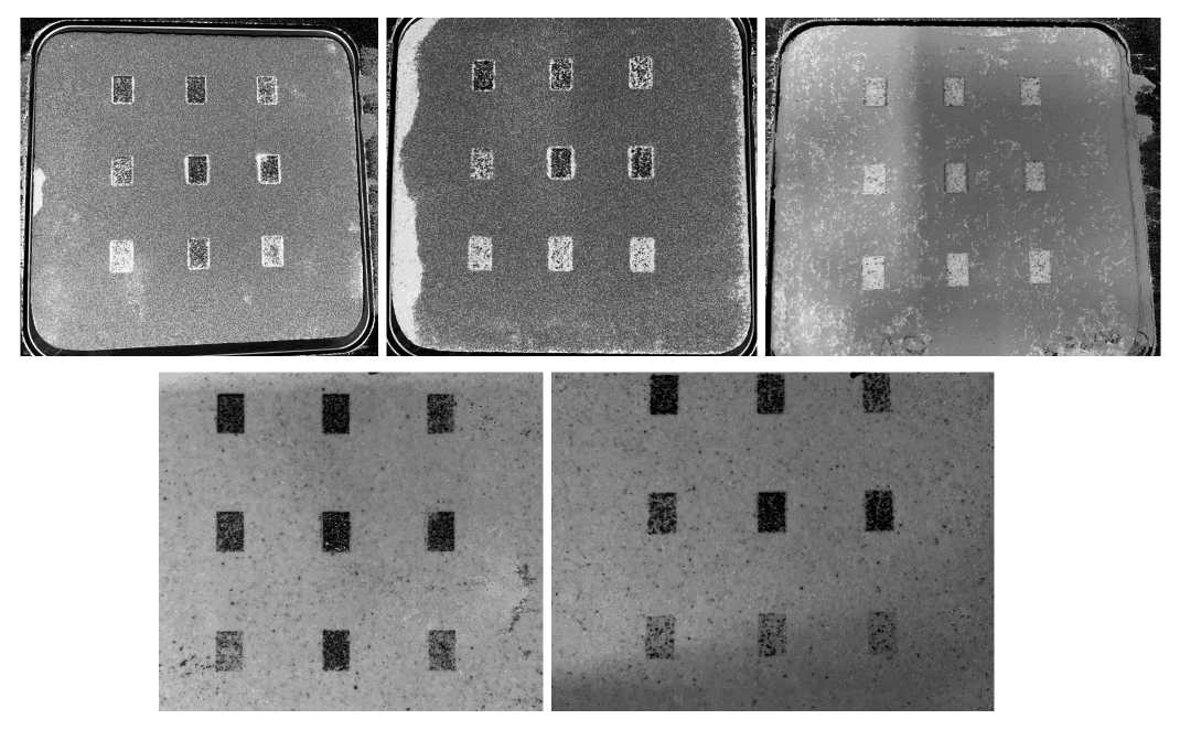 При изготовлении тестовых однослойных образцов на различных режимах работы лазера при изменении объемной плотности подводимой энергии были выявлены оптимальные рабочие режимы СЛС в диапазоне 7.7…14.3 Дж/мм3 (при изменении P в пределах 60…80 Вт и V в пределах 125…175 мм/с и значениях H = 190 мкм и h = 230 мкм), при которых получался качественный однородный слой без шероховатостей / неровностей поверхности и без отрыва слоя от подложки (см. рис. 9). На рис. 9 в верхнем ряду показаны зоны сплавленных одиночных слоев на подложках до удаления остатков порошка после сплавления, в нижнем ряду — после удаления.