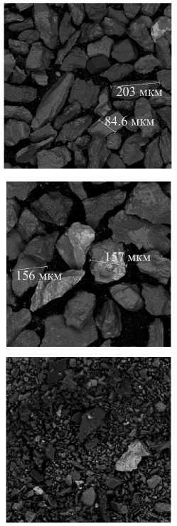 Были проведены исследования морфологии частиц приготовленных композиций. Микрофотографии получены на электронном микроскопе TESCAN VEGA3-XMU. Было установлено, что морфология отдельных частиц порошковых композиций с фракционностью 0…100 мкм, 50…100 мкм и 100…140 мкм имеет такой же характер, что и естественный лунный реголит (рис. 1а,б). В приготовленных композициях присутствуют частицы, как близкие по форме к сферическим (рис. 1в), так и остроугольные и вытянутые частицы (рис. 1г).