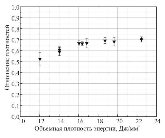 Рис. 5. Зависимость отношения объёмной плотности к истинной плотности образцов от объёмной плотности подводимой энергии, напечатанных из порошковой композиции ГД 100-140.