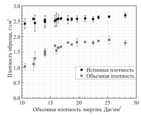 Рис. 2. Зависимость истинной и объёмной плотности образцов от объёмной плотности подводимой энергии для композиции из ГД 50-100.