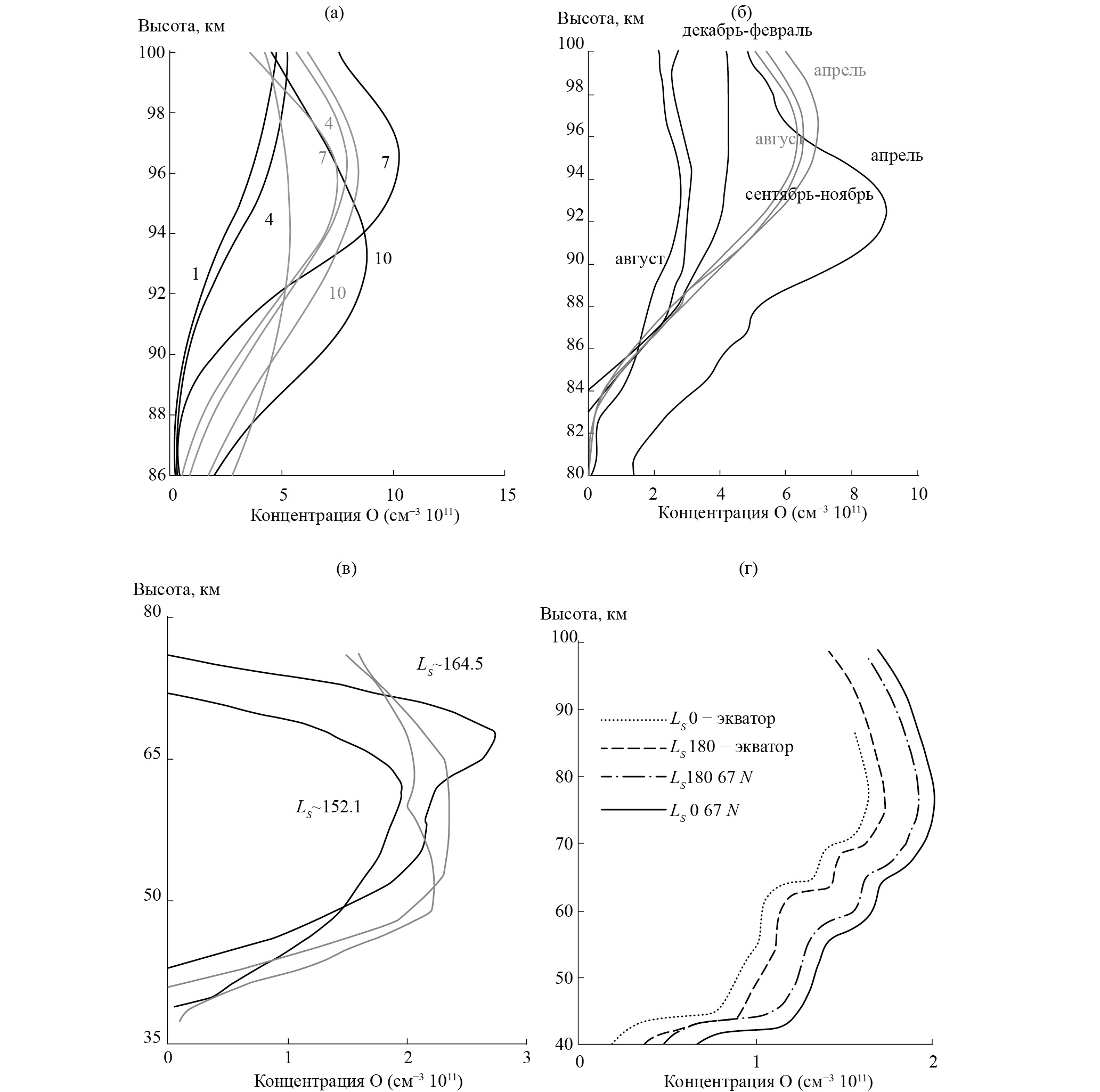 Рис. 1. Высотные профили концентраций О: Панель (а) – темные линии согласно измерениям [1] на средних широтах Земли для 1, 4, 7 и 10-го месяца; светлые линии – данные с NRLMSISE-00 для тех же условий; (б) – темные линии – данные, полученные со спутника TIMED в области экватора Земли (апрель, август) и на северных тропиках (осень, зима) [15]; светлые линии – данные с NRLMSISE-00; (в) – темные линии данные для атмосферы Марса, полученные с ИК-спектрометра SPICAМ для орбит в точках Ls ≈ 152.1°, Ls ≈ 164.5°, 82° ю. ш. Марса [9]; светлые линии – данные с LMD-MGCM; (г) – данные LMD-MGCM, для области экватора и 67° с. ш. Марса, для точек Ls ≈ 180° и Ls ≈ 0° [16]