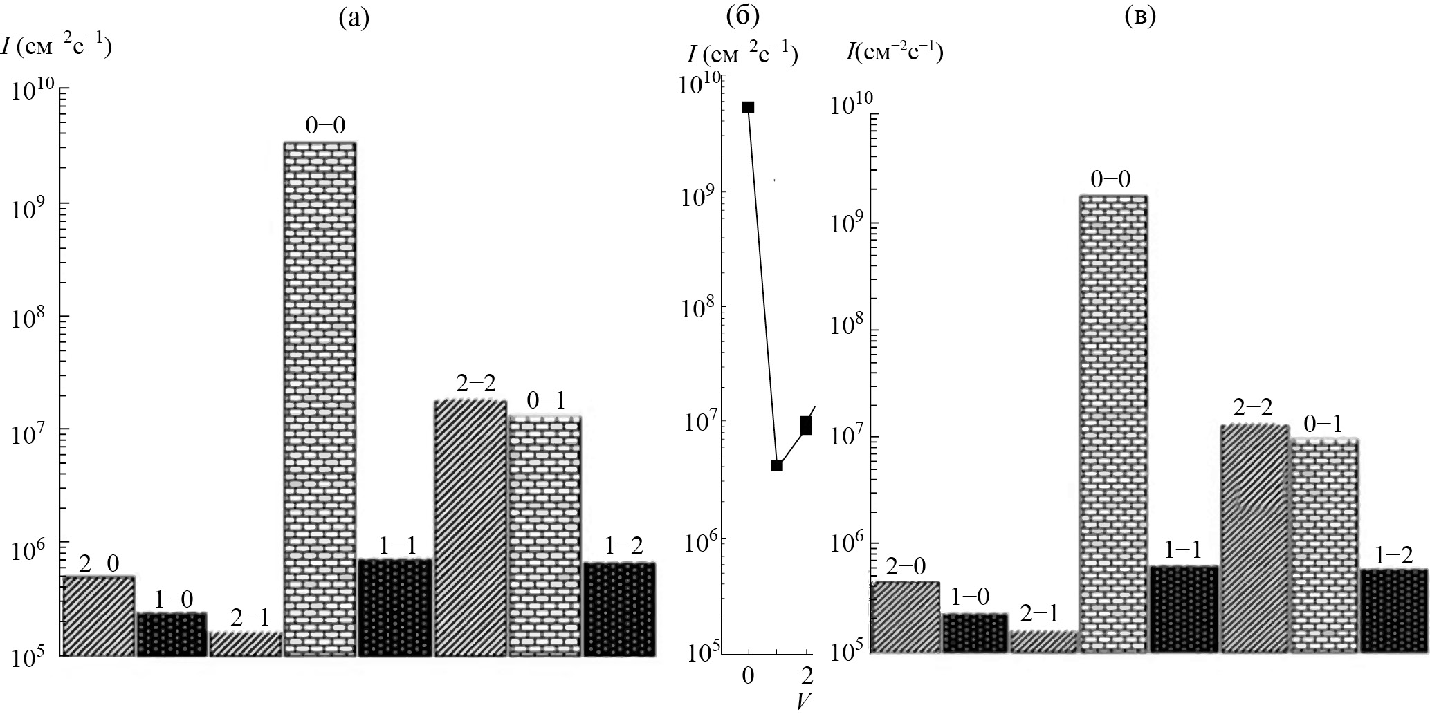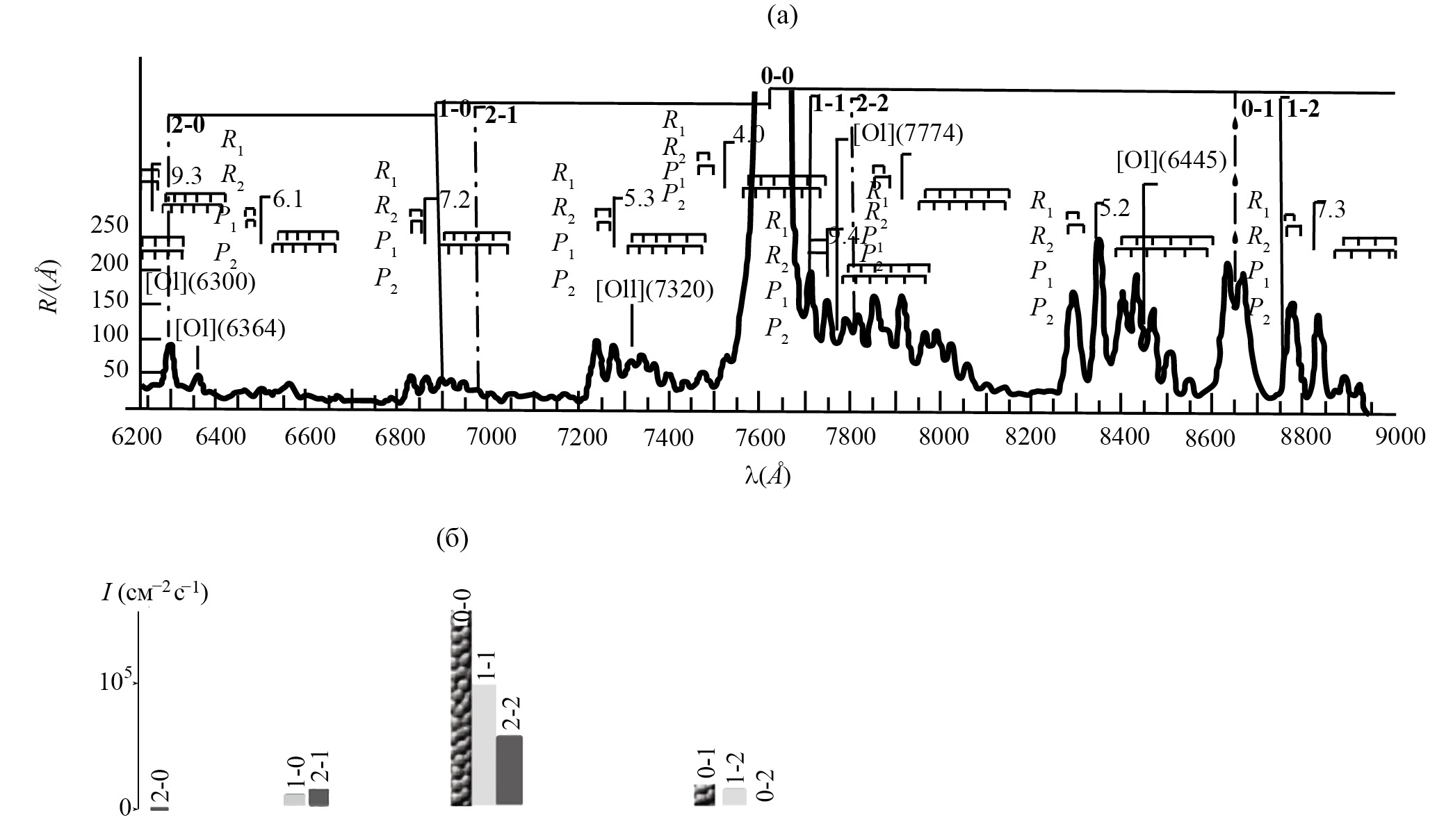 В настоящей работе на рис. 2а и 3а представлен фрагмент усредненного спектра свечения ночного неба в диапазоне 620–900 нм, измеренного спектрографом с космического шаттла Индевор на протяжении его 12-дневной миссии STS69 в сентябре 1995 г. [14]. Значения интенсивности излучения Iv'v'' (см–2 с–1) (гистограммы) для Атмосферных полос, обусловленных переходом (8), были рассчитаны и представлены для этого диапазона длин волн для средних широт Земли на рис. 2б. Каждая двойка цифр над пиками свечения обозначает колебательные уровни (v'–v'') при излучательном переходе (8). Также значения интенсивности излучения были рассчитаны для области экватора северных тропиков Земли (23.5° с. ш.) для осеннего сезона 1995 г. (рис. 2в). Для атмосферы Марса гистограммы для Атмосферных полос были рассчитаны для широты 67° с. ш. при Ls ≈ 180° т. е. для осеннего равноденствия (рис. 3б).
