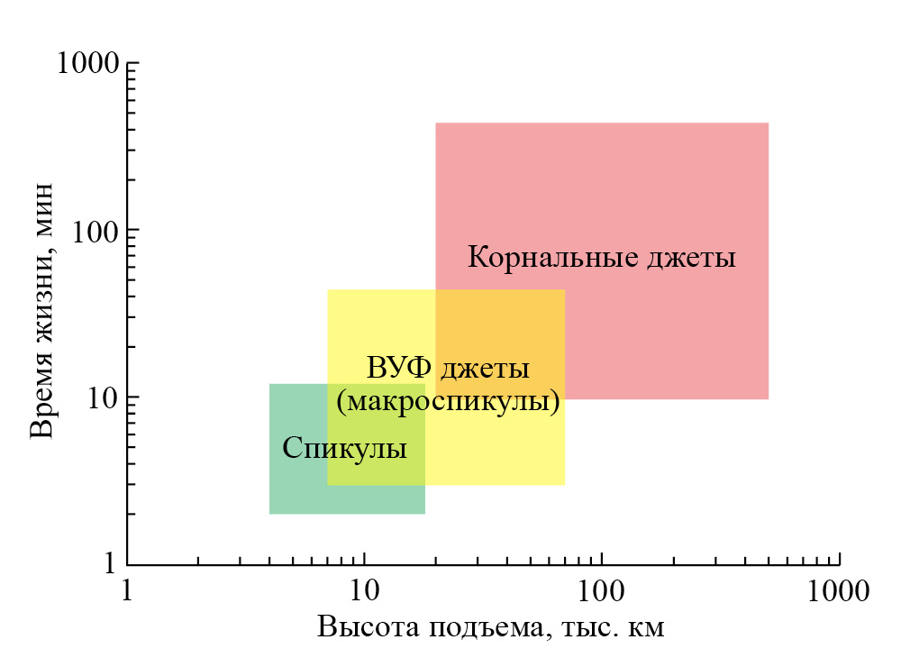 Рис. 1. Различие основных типов солнечных джетов по высоте подъема и времени жизни