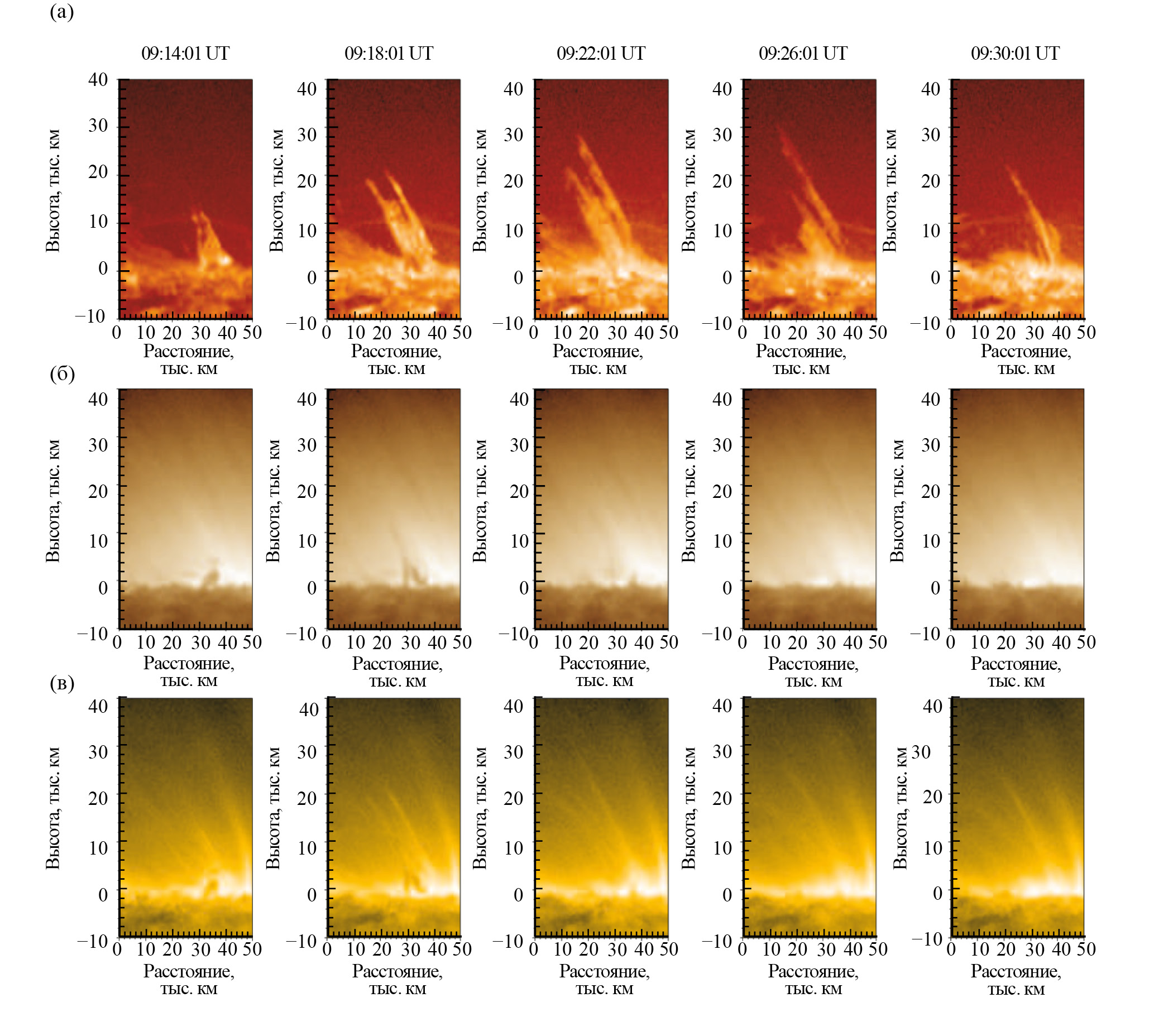 Рис. 2. Пример наблюдений джета-выброса, сформированного эрупцией минифиламента, в каналах 304 Å (а), 171 Å (б) и 193 Å (в) SDO/AIA. В каналах 171 и 193 Å (б, в) видно движение холодного вещества минифиламента на начальной стадии движения джета, в то время как в канале 193 Å (в) одновременно виден выброс горячего коронального вещества