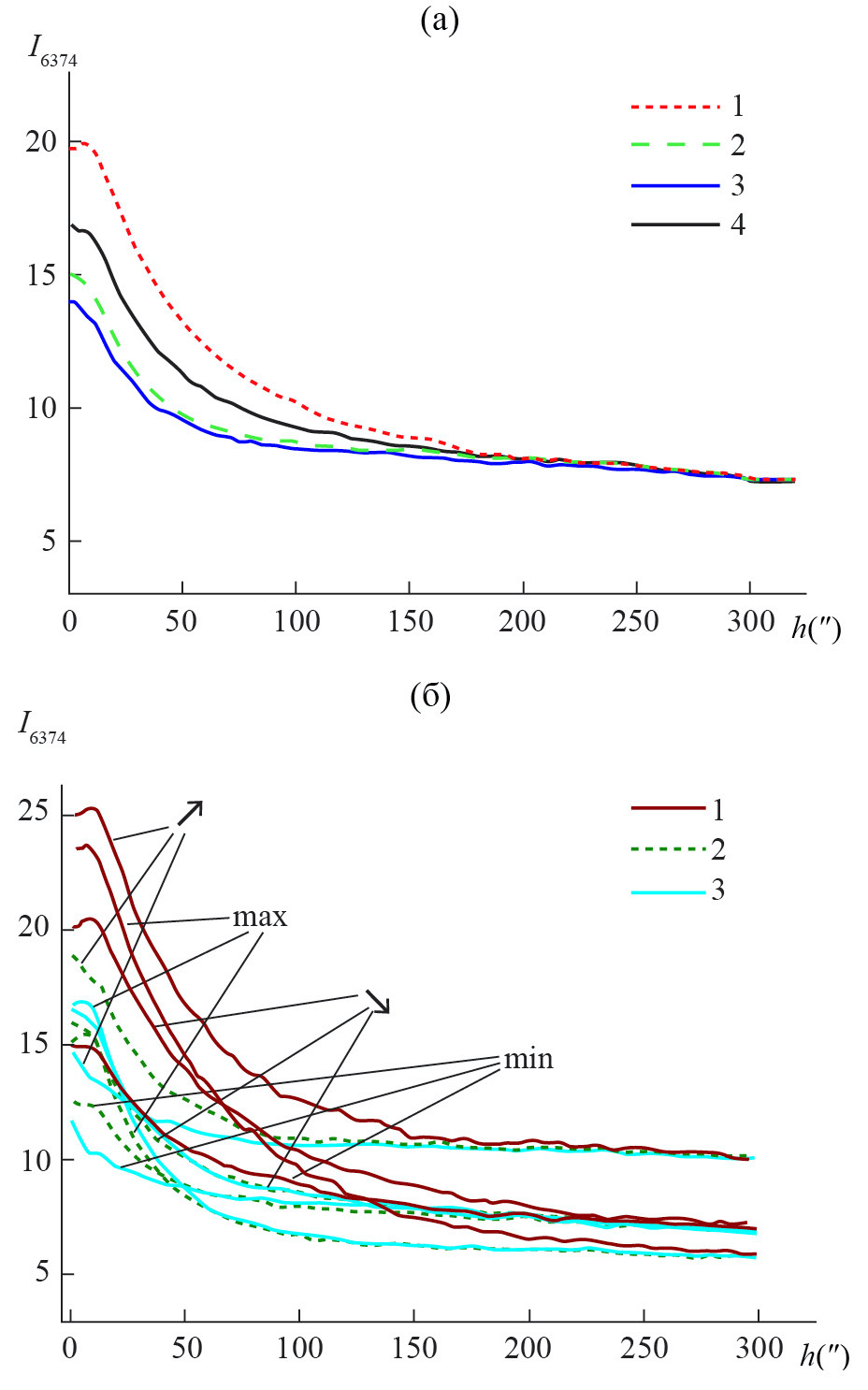 Рис. 5. Изменение с высотой h интенсивности линии λ 6374Å за 24-й цикл СА: (а) – зависимость I6374 для разных широтных зон солнечного лимба: 1 – экваториальной; 2 –средней; 3 – полярной; 4 – всего лимба Солнца; (б) – распределение I6374 отдельно для ветви подъема (↗) и спада (↘), максимальной (max) и минимальной (min) фаз цикла СА, где цифрами указана широтная зона