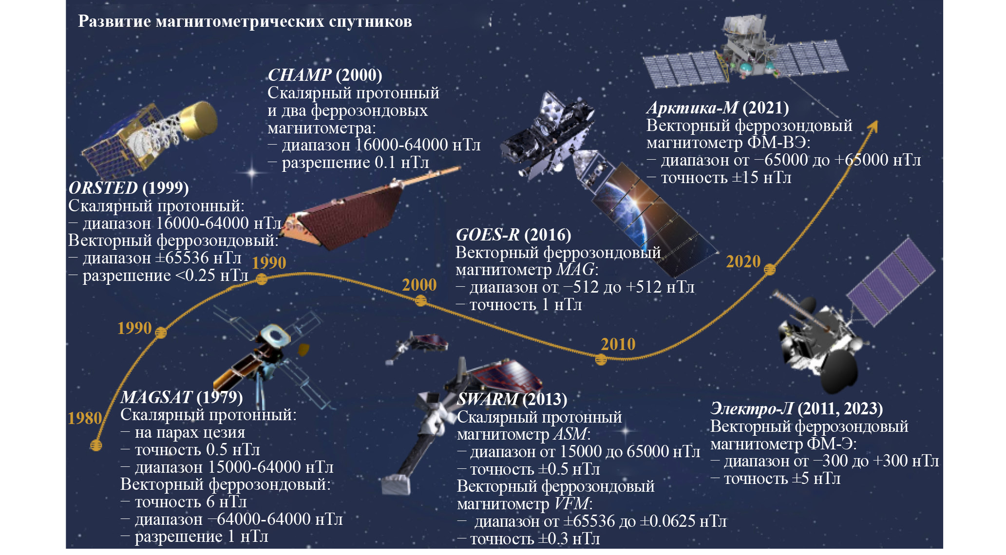 В настоящее время функционируют следующие космические системы (КС) магнитных наблюдений: зарубежные SWARM (круговая наклонная орбита) и GOES (геостационарная орбита), отечественные “Арктика-М” (высокоэллиптическая орбита) и “Электро-Л” (геостационарная орбита) и много других [11]. По открытым данным были выделены основные КС с магнитометрической аппаратурой на борту (рис. 1).