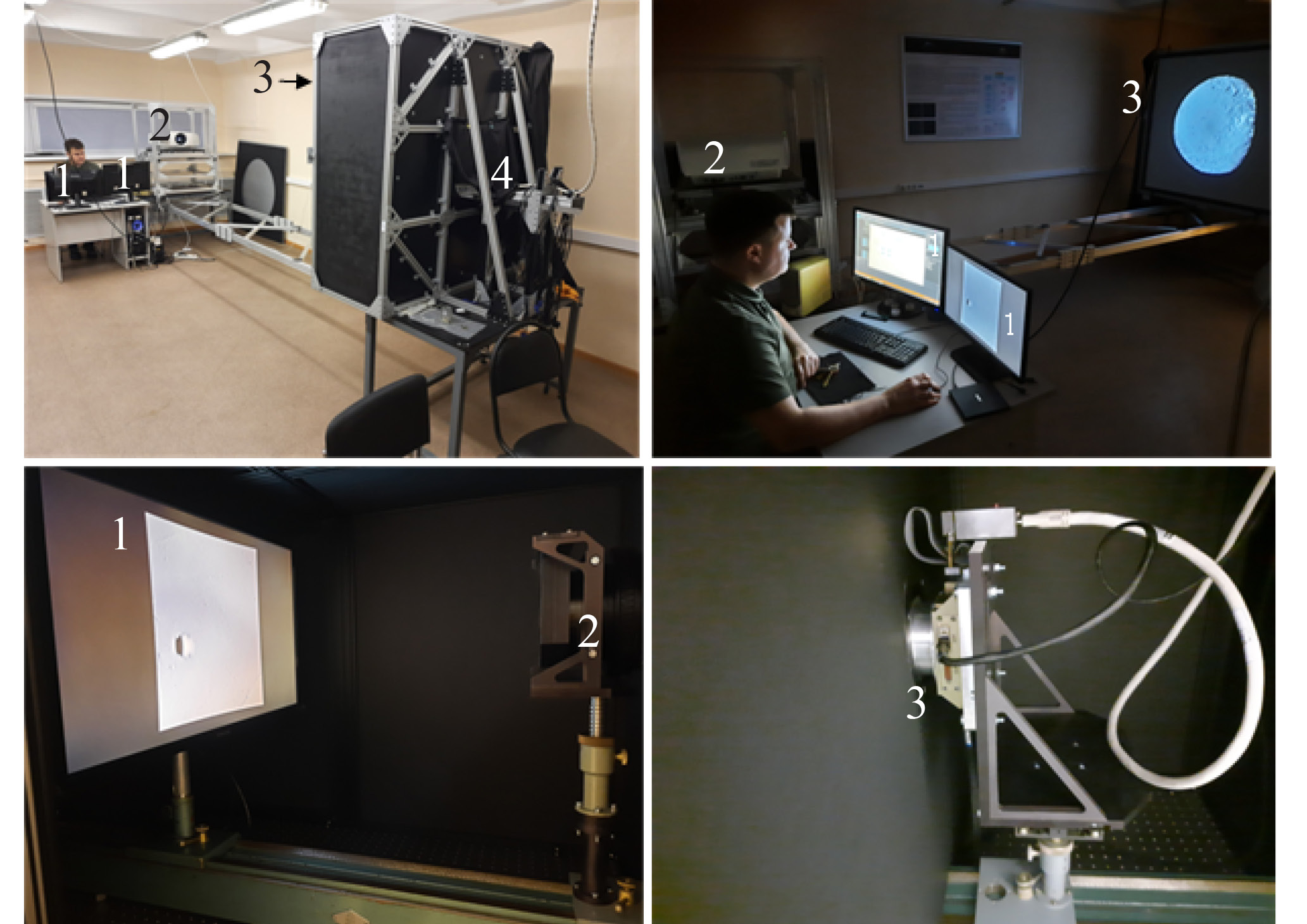 Рис. 1. Стенд отработки технологии автономной оптической навигации: вверху – стенд ШНК (слева) и его проецирующая часть (справа): 1) мониторы управляющего компьютера, 2) оптический проектор, 3) экран, 4) оптическая головка ШНК (закрыта черным покрывалом); внизу: слева – проецирующая часть стенда УНК с проекционным монитором (1) и коллиматорной линзой (2), справа – регистрирующая часть стенда УНК с оптической головкой (3)