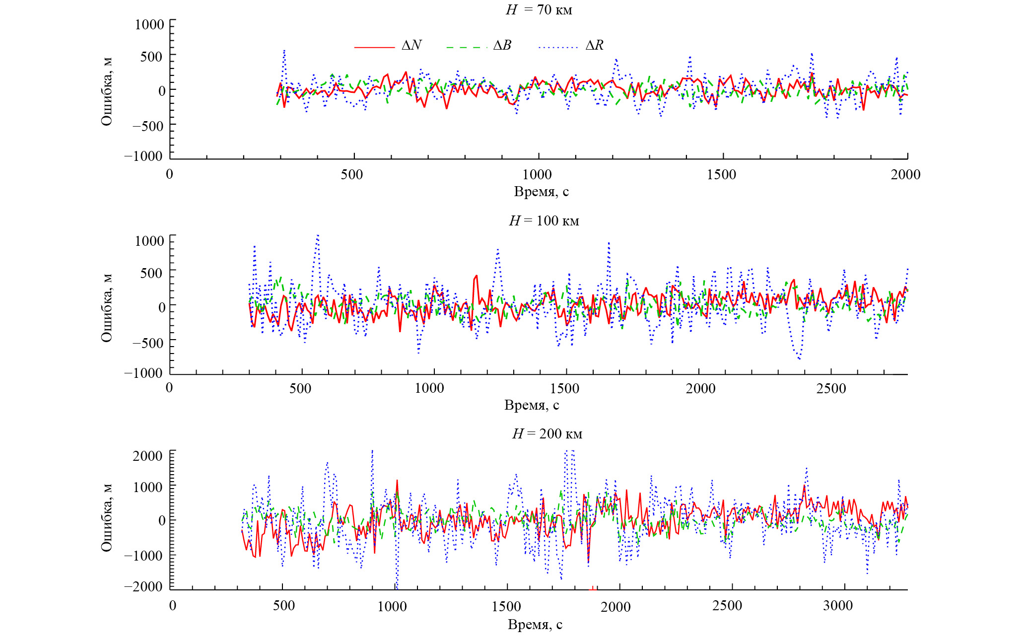 Ошибки измерений координат КА на окололунных орбитах показаны на рис. 3–5, а их среднеквадратичные отклонения (СКО) – в табл. 4. Они представлены в системе координат RNB, где ось R направлена по радиус-вектору КА, ось N – в плоскости орбиты перпендикулярно радиус-вектору в сторону движения КА, ось В – перпендикулярна плоскости орбиты и дополняет систему до правой. Ошибка по оси R равна ошибке по высоте H. Для полярной орбиты ось N направлена примерно по меридиану, ось В – по параллели. Поскольку ПСТ находится как точка пересечения радиус-вектора КА с поверхностью Луны, ошибки в координатах ПСТ получаются умножением ошибок в координатах КА N и B на коэффициент R0/(R0+H), равный отношению расстояний ПСТ и КА до центра Луны.