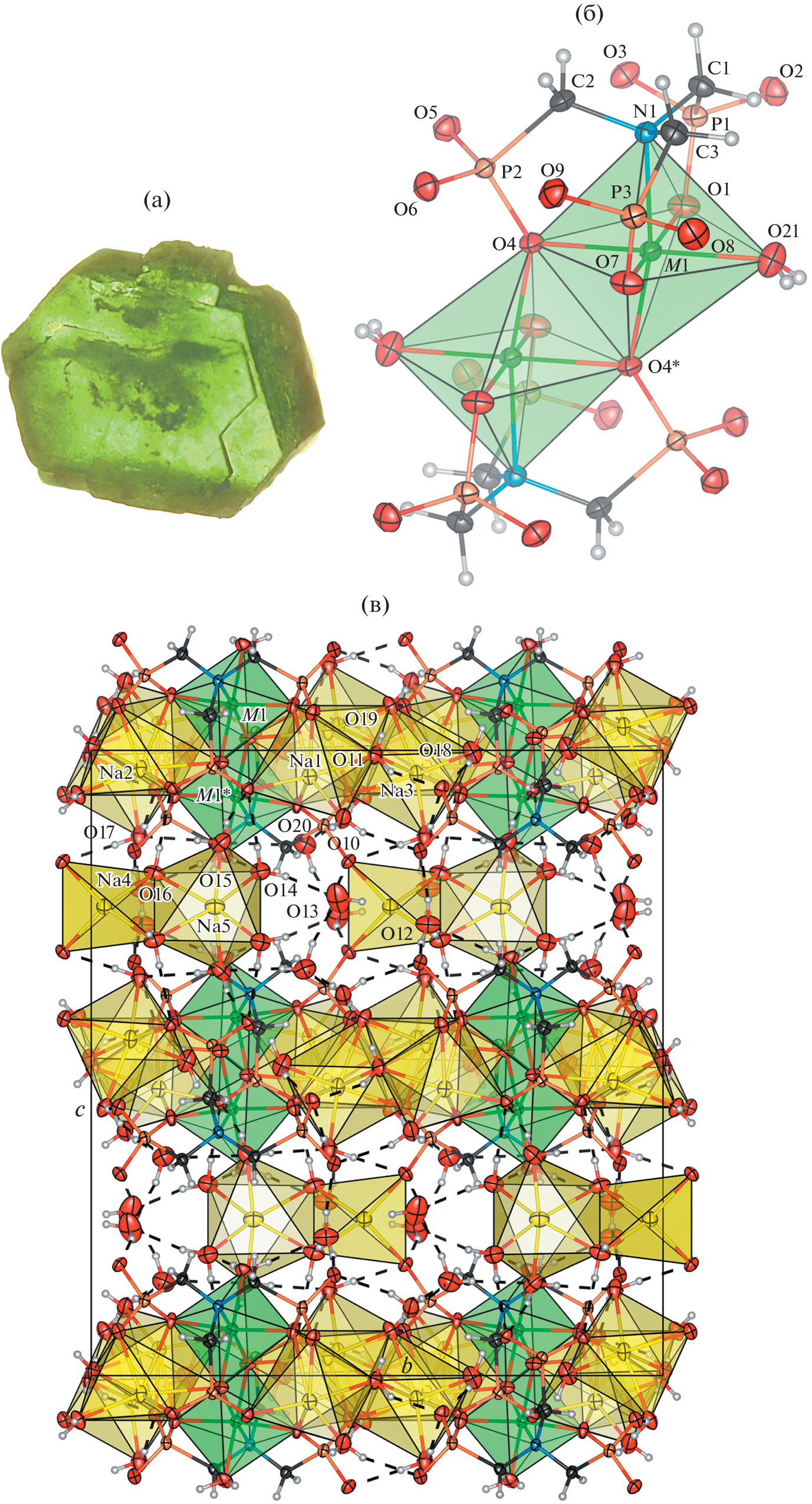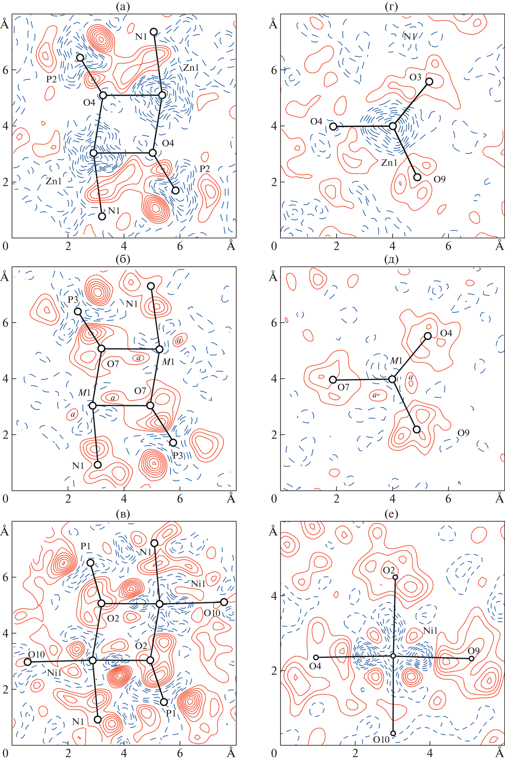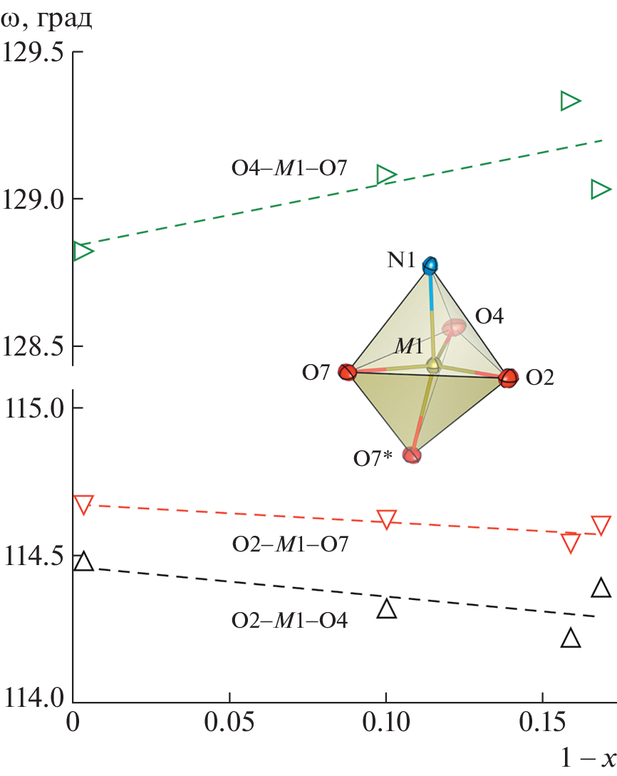 Heterometallic complexes of zinc and nickel with nitrilo-tris(methylenephosphonic acid) Na4[ZnxNi {N(CH2PO3)3}] ⋅ nH2O (x = 0–1) form an isodimorphous substitution series during crystallization. The extreme zinc and nickel terms have, respectively, triclinic and monoclinic structures. The intermediate terms are crystallized in one of the following phases: either in the triclinic phase with dominance of zinc, Na4[(Zn,Ni){N(CH2PO3)3}] ⋅ 13H2O (sp. gr. P , Z = 2, a = 11.171(4)–11.2396(2) Å, b = 11.2612(5)–11.28800(10) Å, c = 12.3241(5)–12.35530(10) Å, α =108.422(4)°–108.4510(10)°, β = 97.1603(16)°–97.1790(10)°, γ = 117.0870(10)°–117.133(2)°) and trigonal-bipyramidal coordination of metal atom, or in the monoclinic phase with dominance of nickel, Na4[(Ni,Zn)(H2O){N(CH2PO3)3}] ⋅ 11H2O (sp. gr. C2/c, Z = 4, a = 11.9987(2)–12.05615(18) Å, b = 18.6231(3)–18.7073(3) Å, c = 21.0758(3)–21.1264(4) Å, β =104.3044(17)°–104.3688(16)°) and octahedral coordination of metal atom. The dependence of the bond angle, type of chemical bonding, and spectroscopic and magnetic properties on the fraction of zinc among complexing metals in the crystal, x = [Zn]/([Zn] + [Ni]), has been studied.