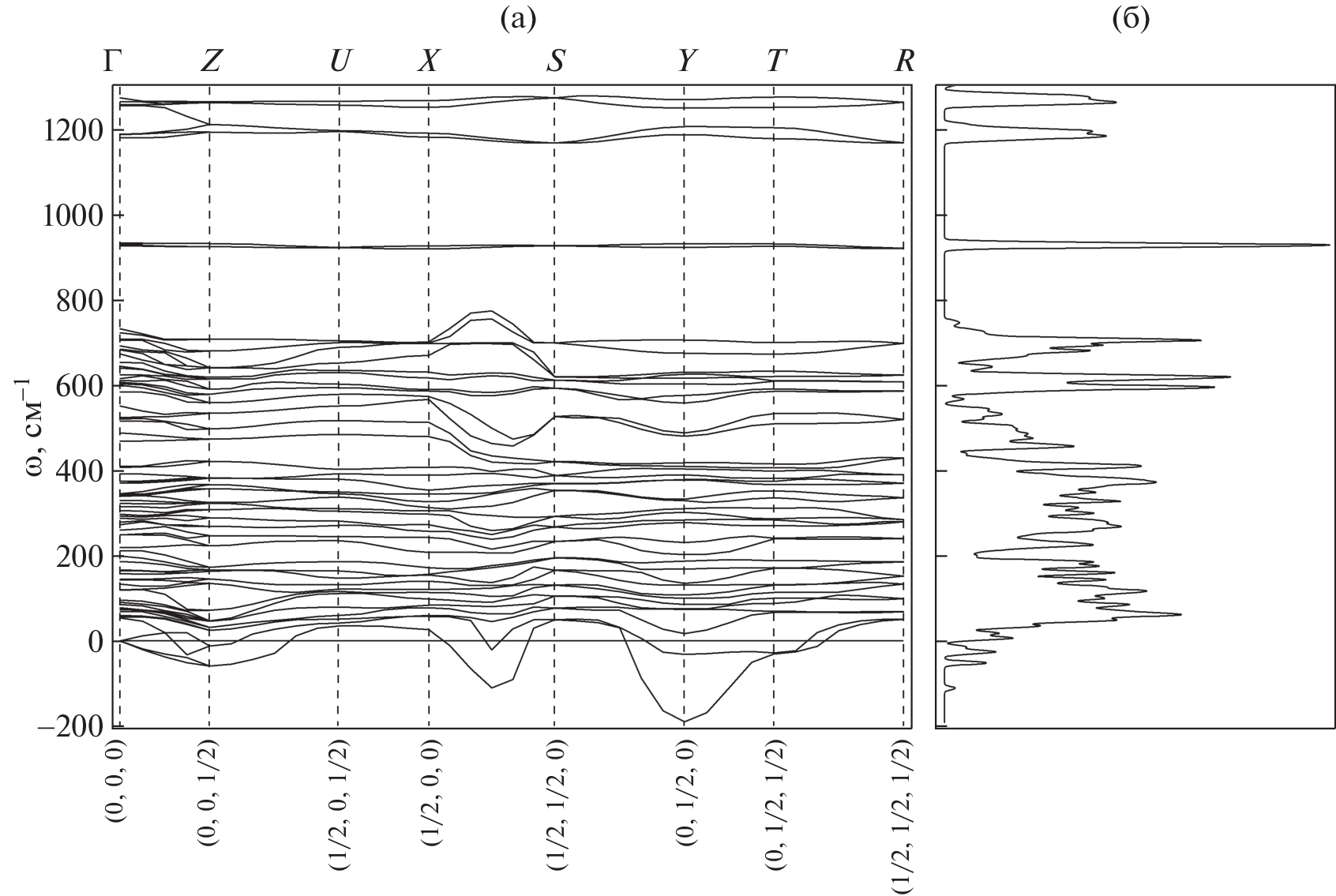 The phonon dispersion and Raman spectrum of the PbMnBO4 ferromagnetic crystal have been calculated within the density functional theory. Imaginary phonon branches have been observed at the points Y, Z, and Г and along the X–S direction of the Brillouin zone, which indicates structural instability and a possible phase transition with variation in external factors (temperature and pressure). The shapes of vibrations and symmetry types of the normal modes of the crystal at the center of the Brillouin zone have been determined. The calculation results are compared with the experimental and theoretical spectra from other studies. It is shown that the vibrational mode of highest intensity at 692.5 cm–1 in the spectrum and the mode at 272.3 cm–1, corresponding to the experimental modes at 690.5 and 224.7 cm–1, are bending vibrations of oxygen atoms in distorted MnO6 octahedra.