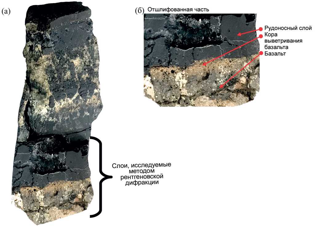Образец корки толщиной 15 см был вырезан из массива вместе с частью базальтовой основы, на которой она образовалась (рис. 2). Без нарушения целостности корки послойно с помощью неразрушающих физических методов (рентгенофлуоресцентного анализа (РФлА) и рентгенодифракционного) был исследован ее химический и фазовый состав. Для подробного изучения возможных механизмов образования рудоносного слоя были выбраны три различающихся по цвету и лежащих в основании корки нижних слоя: базальт, кора выветривания базальта и первый рудоносный слой (рис. 2). Для проведения неразрушающих рентгеновских анализов была отделена и отшлифована нижняя часть корки, содержащая эти слои (рис. 2б).