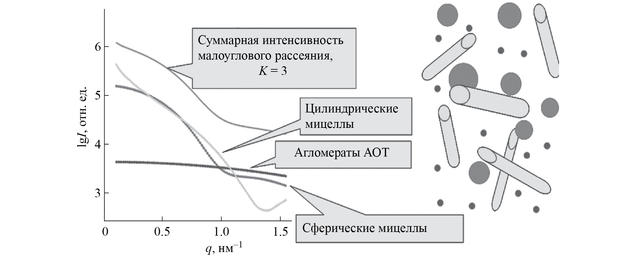 Рис. 1. Интенсивность МУРР от модели трехкомпонентной системы мицелл АОТ–вода в изооктане