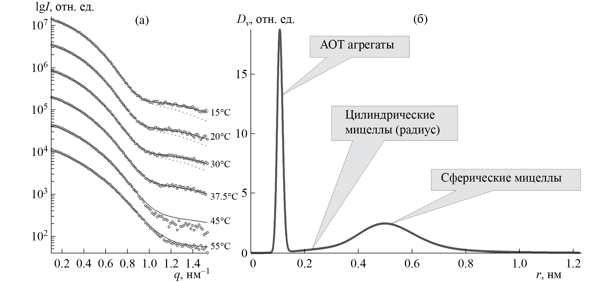 Рис. 3. Интенсивности МУРР раствора мицелл АОТ–вода в изооктане при разных температурах (а), б – найденное объемное распределение по радиусам частиц (б)