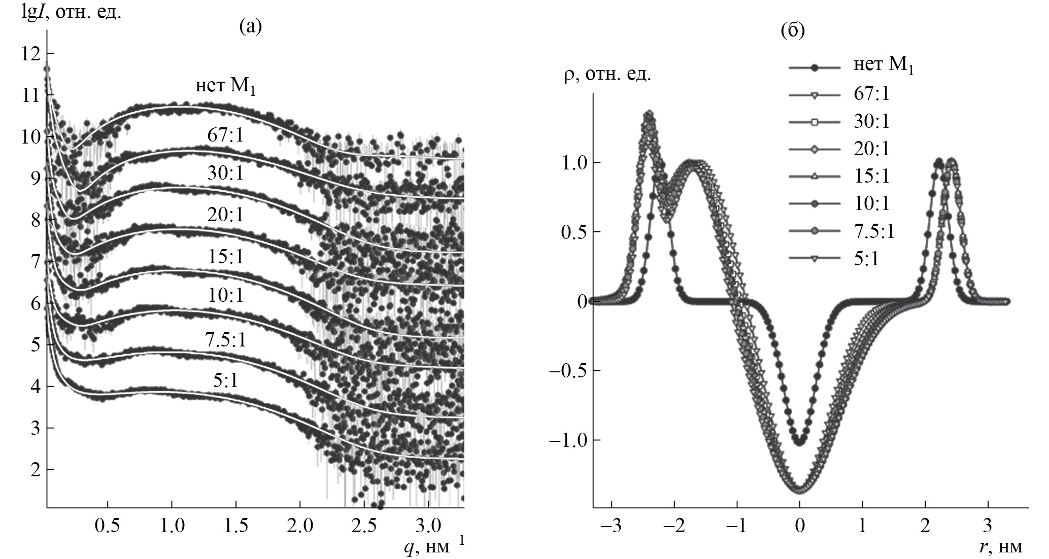 Рис. 4. Интенсивности МУРР от растворов смеси липосом 10% DOPS + 90% DOPC с разным молярным соотношением липид/белок М1 (а). Белые линии – теоретическая интенсивность, соответствующая моделям профилей плотности липидного бислоя (панель б). Пик плотности ρ в области z ~ 2.3 нм относительно центра липидного бислоя соответствует адсорбированным молекулам матриксного белка М1