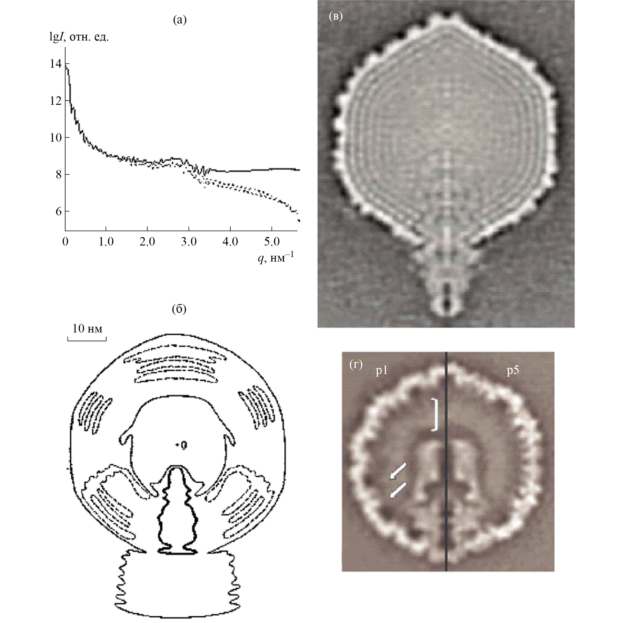 Рис. 5. Анализ структуры бактериального вируса Т7: а – данные рентгеновского МУР (верхняя панель; сплошная кривая – эксперимент, пунктирная – рассеяние моделью), б – контуры восстановленной плотности фаговой частицы [20], в, г – структура целой частицы и фагового прокапсида соответственно по данным крио-ЭМ [21], найденные 25 лет спустя