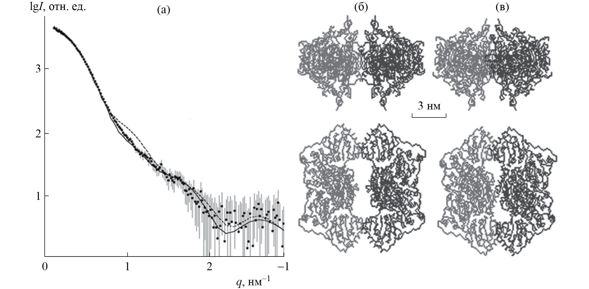 Рис. 7. Пример уточнения кристаллической доменной структуры фермента пируватдекарбоксилазы методом молекулярной тектоники [32]: а – данные рассеяния: ломаная линия – эксперимент, черная – теоретическое рассеяние от модели МУР (в), пунктир – рассеяние от кристаллической модели (б)