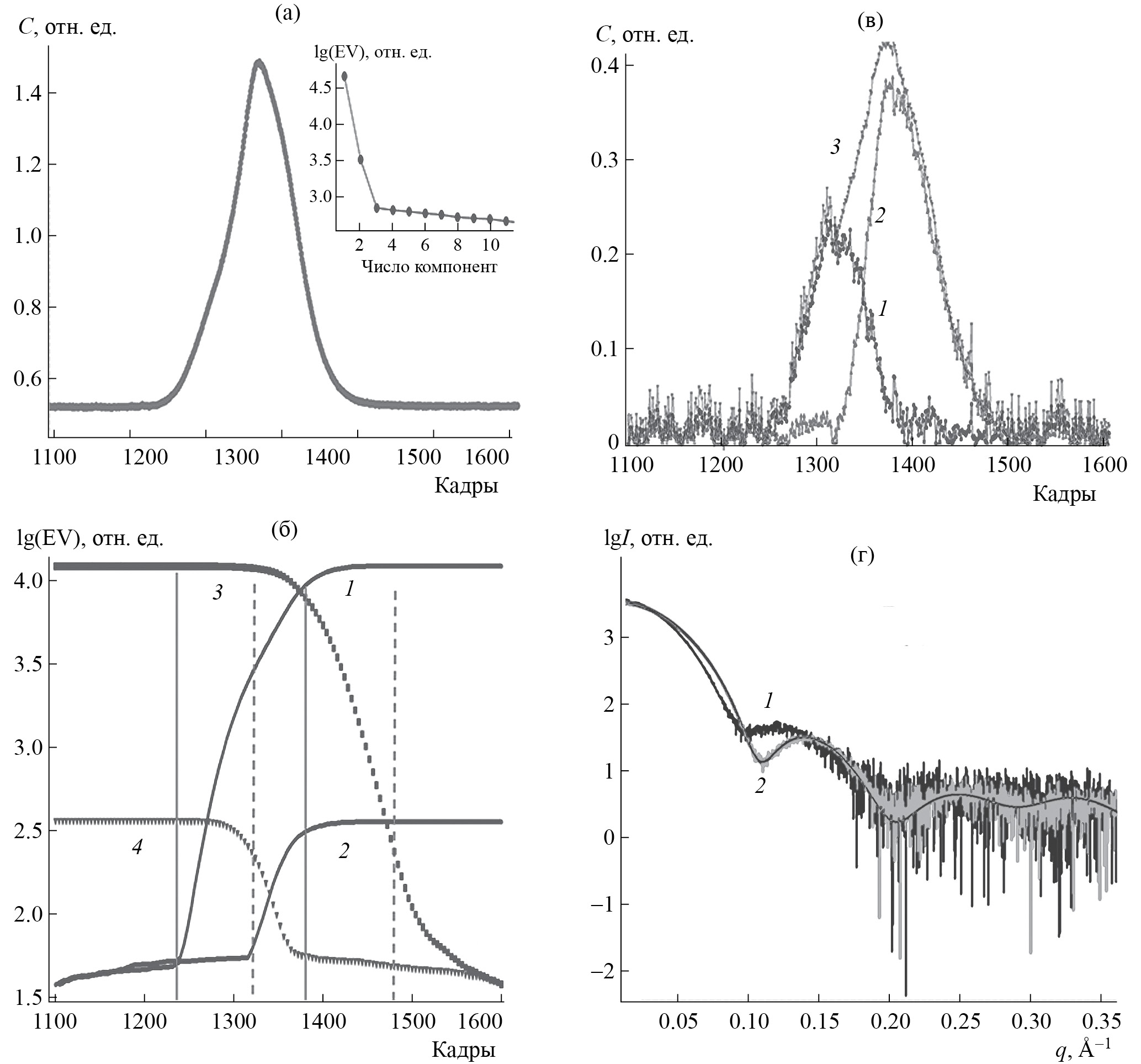 Рис. 8. Хроматографической профиль (C – относительная концентрация) раствора альдолазы, интервал съемки кадров ~1 с, на врезке – спектр сингулярных чисел матрицы измерений, видны два значимых компонента (а); эволюция величин первых двух сингулярных чисел с ростом включенных кадров (1, 2 – прямой ход расчета) и с ростом исключенных (3, 4 – обратный ход), вертикальными линиями обозначены временные моменты изменения числа компонентов (б); рассчитанные методом факторного анализа концентрационные профили выхода компонентов: 1 – октамеры, 2 – гексамеры, 3 – суммарный контур (в); найденные профили интенсивности рассеяния от компонентов (г) (обозначения те же)