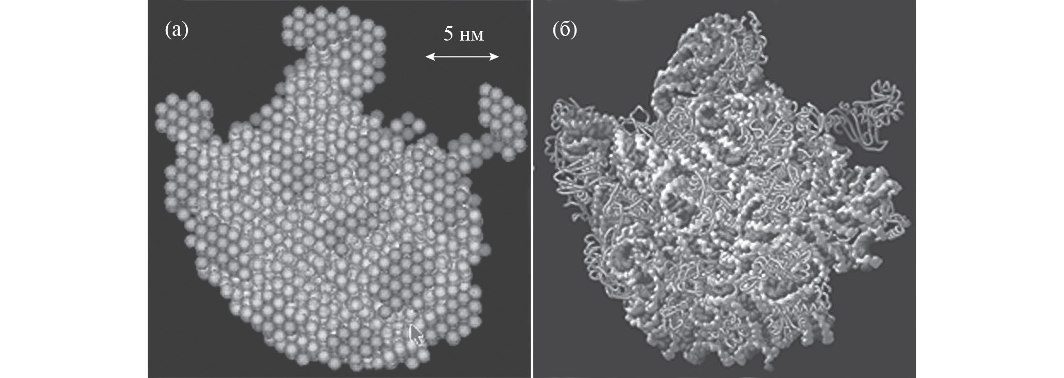 Рис. 9. Шариковая структура частицы рибосомы 50S по данным МУРН [38] (а), кристаллическая модель, найденная впоследствии [39] (б). Более светлые шарики в модели а означают фазу РНК, темные – области, занятые белками