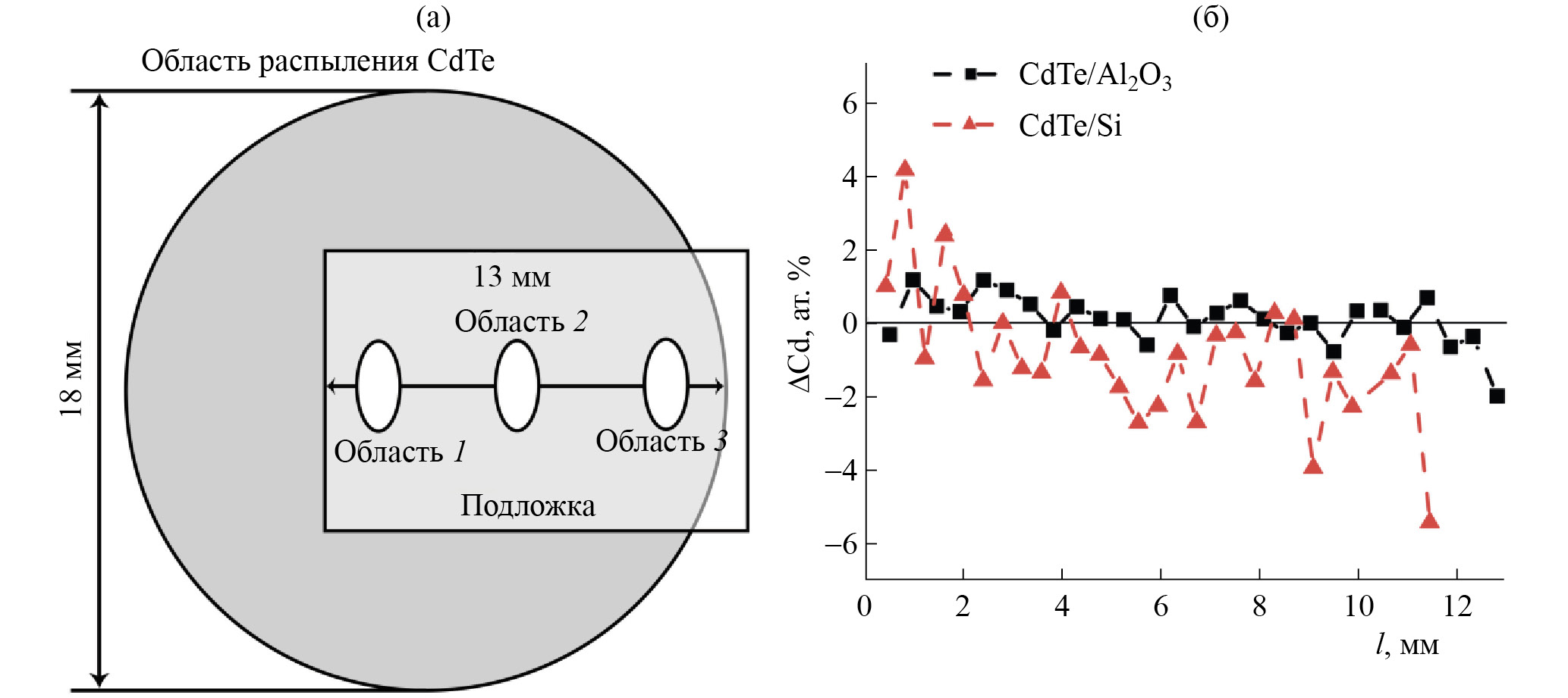 Расположение подложки относительно области распыления CdTe в установке термического напыления представлено на рис. 1а. Выращенные образцы тонких пленок CdTe показали соотношение элементов Cd к Te, близкое к стехиометрии (рис. 1б). Образец, выращенный на подложке Si, имел большее отклонение от стехиометрии по длине образца по сравнению с образцом, выращенным на подложке Al2O3, где разброс элементного состава по длине не превышал 1%, за вычетом крайней точки.