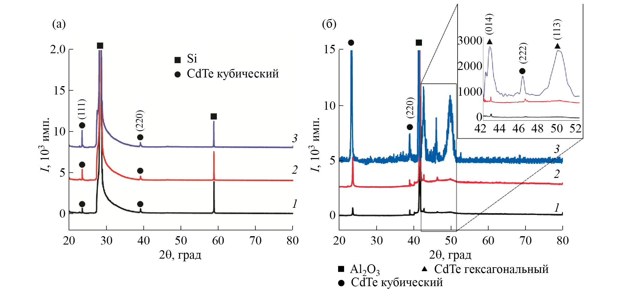 Рис. 2. Рентгеновские дифрактограммы тонких пленок CdTe, выращенных на подложках Si (а) и Al2O3 (б). На врезке – увеличенная область дифрактограммы для тонкой пленки, выращенной на подложке Al2O3, в интервале углов 42°–52°. Номера кривых соответствуют номерам областей на рис. 1а