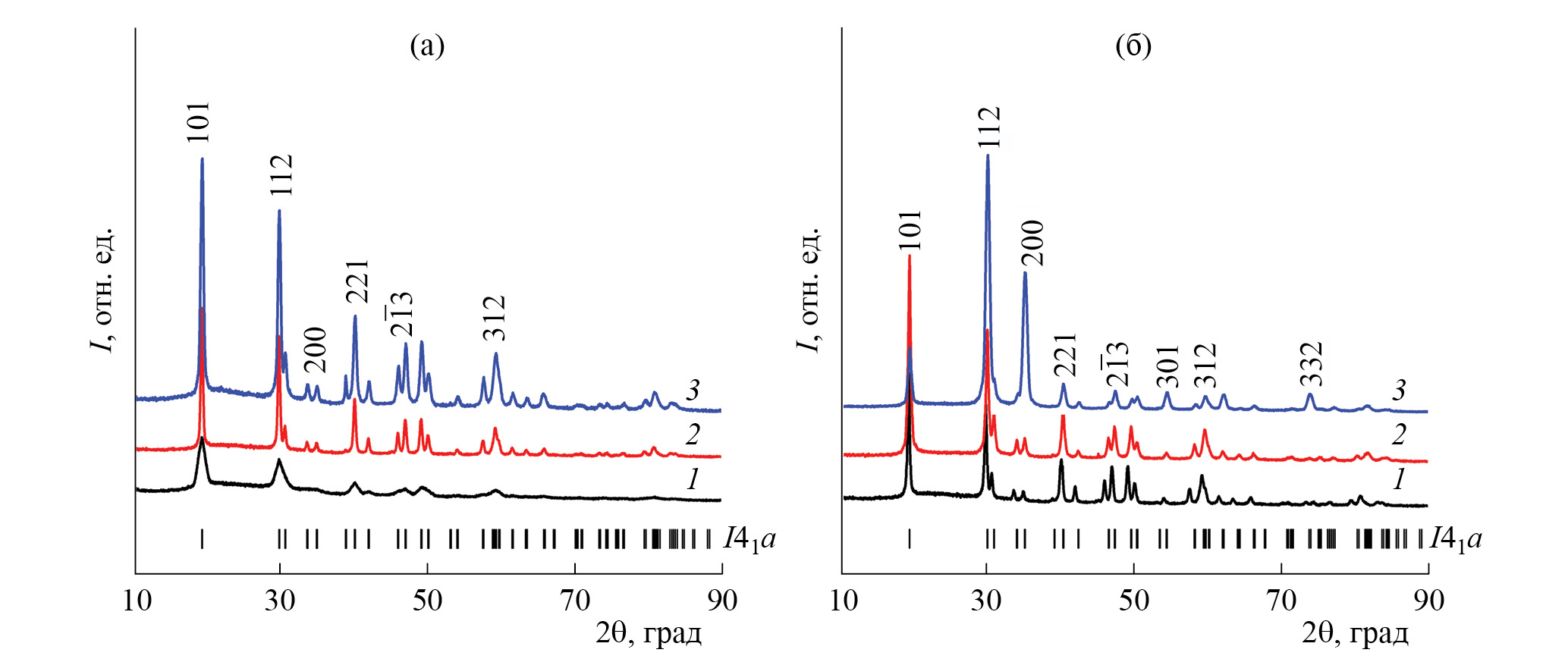 Рис. 2. Рентгенограммы НЧ LiRF4, синтезированных при различном соотношении прекурсоров n(Li+):n(R3+):n(F-) (а): 1:1:4 (1), 1.75:1:4 (2), 2.5:1:4 (3); катионном составе кристаллической матрицы (б): R = Y (1), Yb (2), Lu (3) и соотношении прекурсоров 1.75:1:4