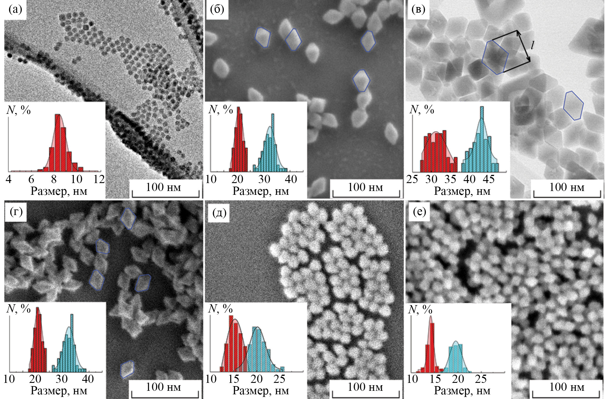Объемы НЧ LiRF4 со структурой затравка/ядро/оболочка со средними размерами 20 15 нм2 (nпрек:nзатр = 20) и 58 38 нм2 (nпрек:nзатр = 160) составили ~ 1500 и 27500 нм3, что идентично гексагональным НЧ β-NaYF4 с латеральными размерами 2a, равными 14 и 38 нм соответственно (при h = 1.2a). В процессе синтеза были получены монодисперсные сферические и частично ограненные НЧ β-NaYF4:Yb3+/Tm3+@NaYF4 и β-NaYF4:Yb3+/Er3+@NaYF4 (пр. гр. P63/m) со структурой ядро/оболочка и средними размерами, идентичными рассчитанным (рис. 5г, 5д).