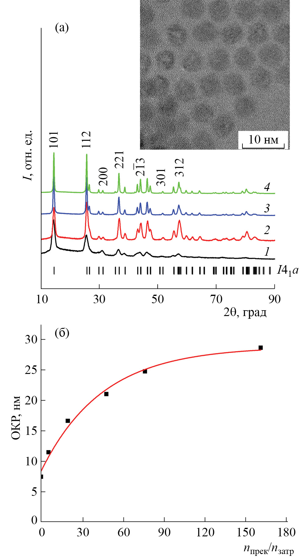 Рис. 4. Рентгенограммы нанозатравок LiYF4 (1) и структур, полученных после нанесения одной (2), трех (3) и пяти (4) эпитаксиальных оболочек LiYF4:Yb3+/Er3+ (а); ПЭМ-изображение затравок LiYF4 приведено во вставке. Зависимость размерности НЧ LiYF4:Yb3+/Er3+ от соотношения nпрек:nзатр (б)