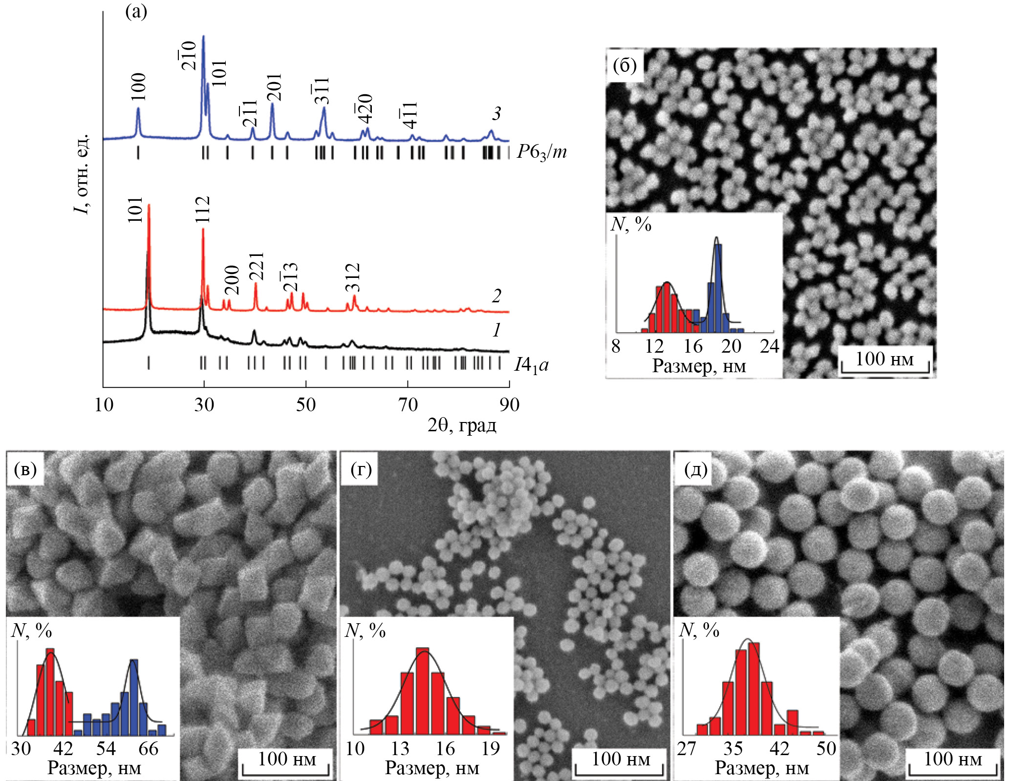Рис. 5. Рентгенограммы НЧ LiYF4@LiYF4:Yb3+/Tm3+@LiYF4 (nΣпрек:nзатр = 20) (1), LiYF4@LiLuF4:Yb3+/Er3+@LiYF4 (nΣпрек:nзатр = 160) (2) со структурой затравка/ядро/оболочка и реперных НЧ β-NaYF4:Yb3+/Tm3+@NaYF4 (а). СЭМ-изображения НЧ LiYF4@LiYF4:Yb3+/Tm3+@LiYF4 (б), LiYF4@LiLuF4:Yb3+/Er3+@LiYF4 (в), β-NaYF4:Yb3+/Tm3+@NaYF4 (г), β-NaYF4:Yb3+/Er3+@NaYF4 (д) с соответствующими гистограммами размерного распределения