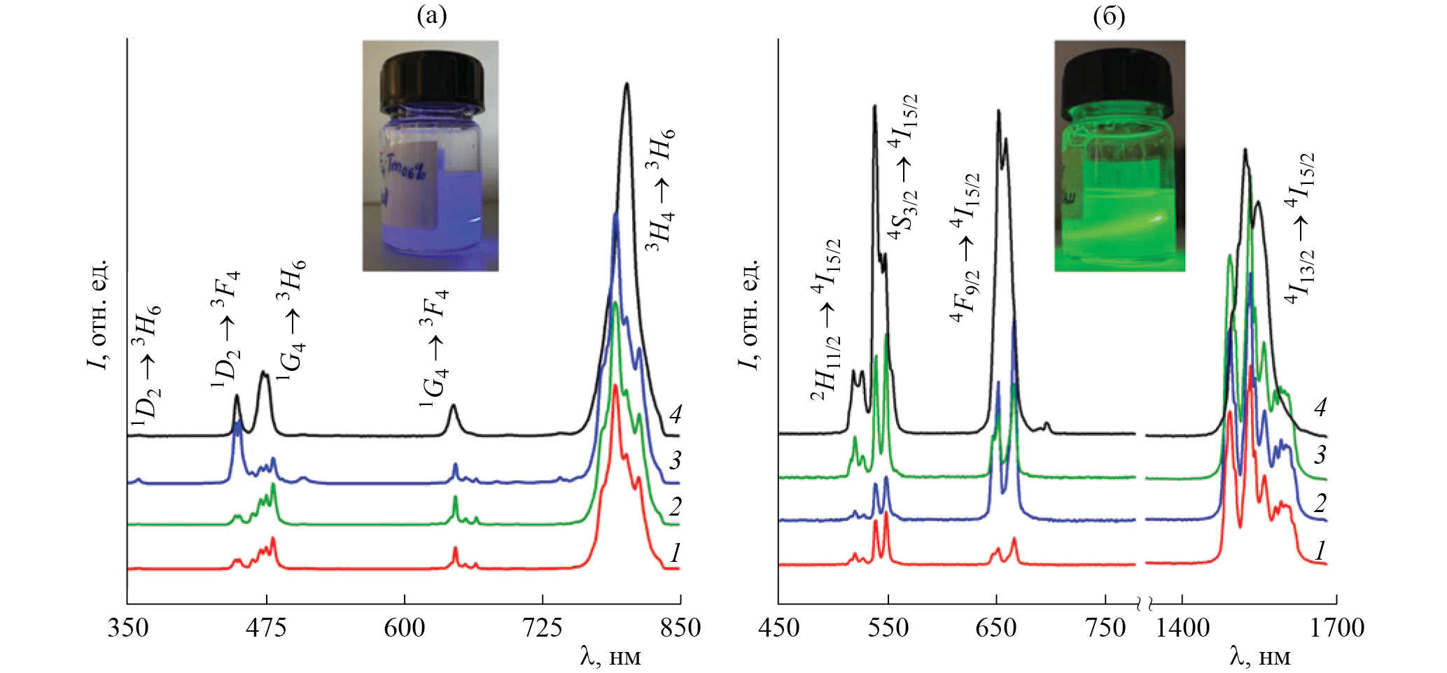 Рис. 6. Спектры ФЛ НЧ LiYF4 (1), LiYbF4 (2), LiLuF4 (3), β-NaYF4 (4), легированных ионами Yb3+/Tm3+ (а) и Yb3+/Er3+ (б). Внешний вид и наблюдаемая ФЛ коллоидов НЧ LiYF4@LiYF4:Yb3+/Tm3+@LiYF4 и LiYF4@LiLuF4:Yb3+/Er3+@LiLuF4, полученных при возбуждение излучением λ = 975 нм, показаны по вставках