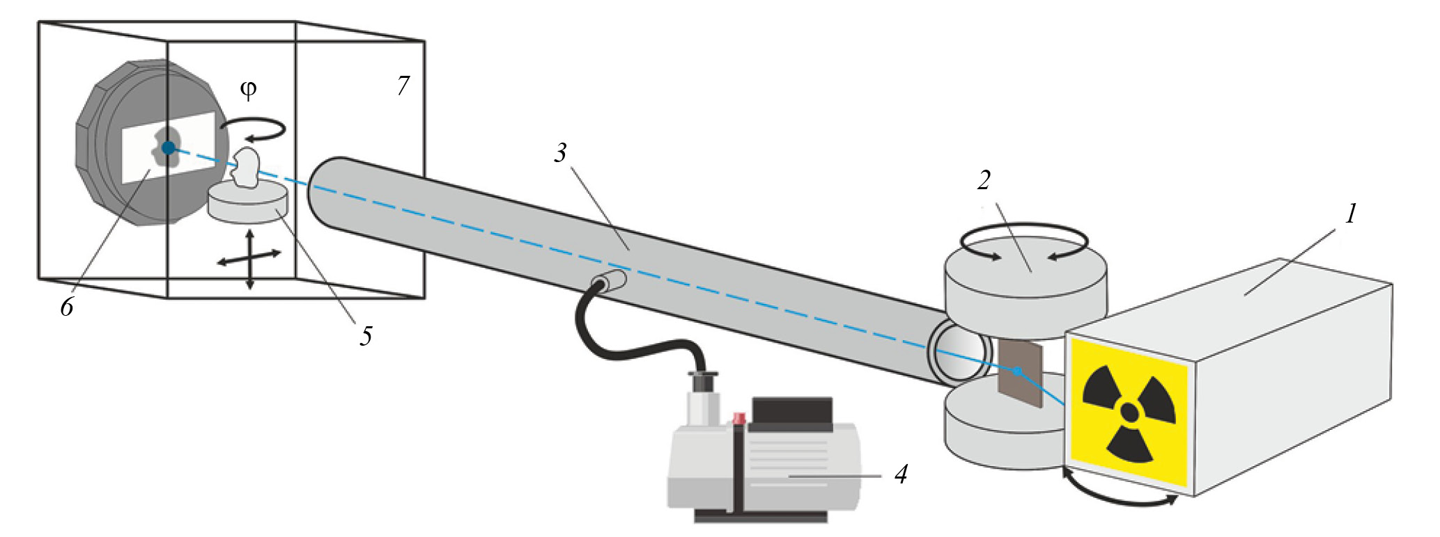 Рис. 1. Схема рентгеновского микротомографа “ТОМАС”: 1 – источник рентгеновского излучения (рентгеновская трубка), 2 – блок монохроматора, 3 – вакуумный путь (коллиматор), 4 – вакуумный насос, 5 – изучаемый образец на системе позиционирования, 6 – рентгеновский детектор, 7 – зона локальной радиационной защиты