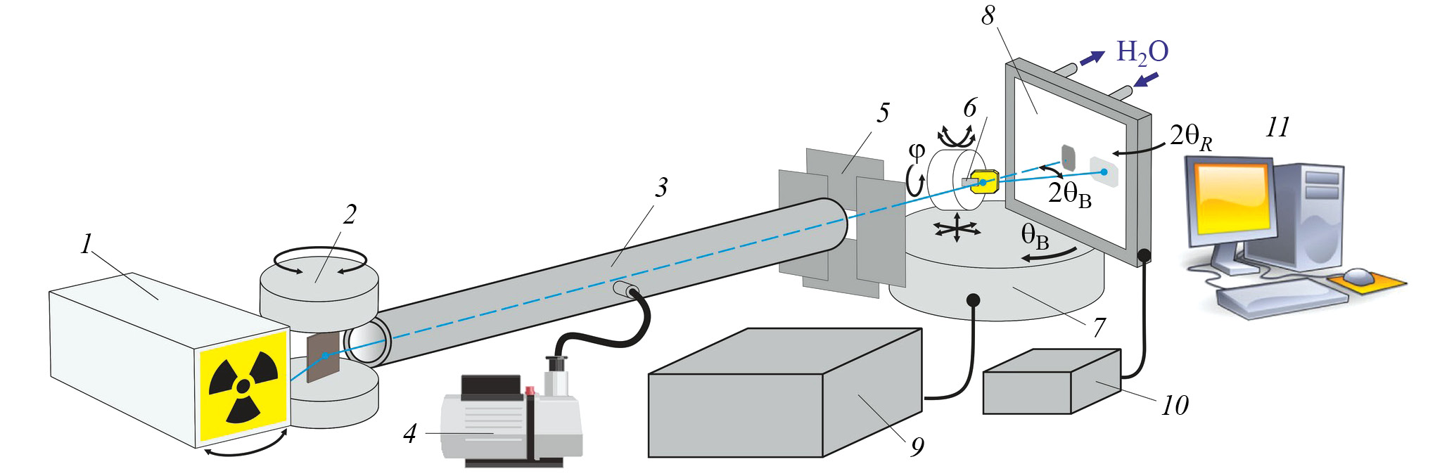 Рис. 3. Схема дифрактометра “ДИТОМ–М”: 1 – рентгеновская трубка, 2 – блок с кристаллом-монохроматором, 3 – трубчатый коллиматор, 4 – вакуумный насос, 5 – пара взаимно перпендикулярных щелей, 6 – гониометрическая головка с исследуемым кристаллом, 7 – восьмиосевой гониометр, 8 – блок управления гониометром, 9 – двумерный рентгеновский детектор XIMEA xiRAY11, 10 – лабораторный источник питания для детектора, 11 – персональный компьютер