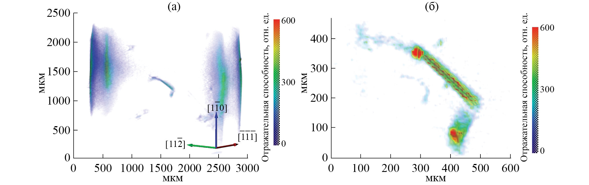 Результаты восстановления отражательной способности кристалла представлены на рис. 4. Полученный объем данных и проведенные оценки позволили более детально изучить строение дислокаций. Установлено, что глубина залегания дефекта не превышает 150 мкм, полная длина составляет ~700 мкм, в то время как длина среднего участка дислокационной полупетли ~350 мкм. Отметим, что для уточнения этих параметров требуются более высокое пространственное разрешение и мощные источники рентгеновского излучения. Тем не менее для некоторых практических целей, а именно установления пространственного расположения дефектов и их трансформации при различных внешних воздействиях, достигаемого разрешения ~10 мкм вполне достаточно [10, 11].
