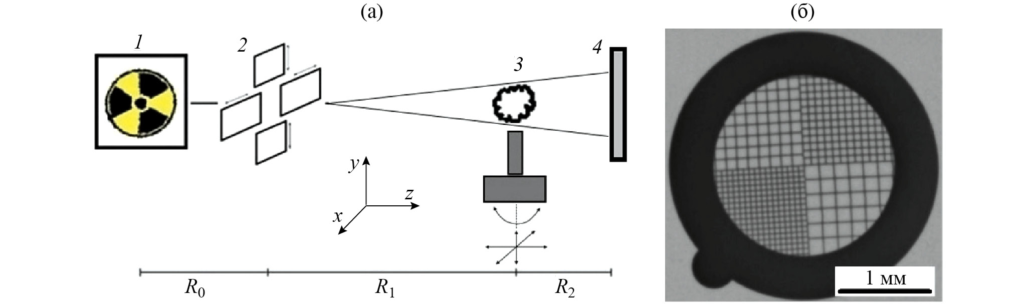 Рис. 6. Схема фазоконтрастного эксперимента (а): 1 – широкофокусная рентгеновская трубка, 2 – щелевая апертура, 3 – исследуемый образец, установленный на гониометрическом устройстве, 4 – ПЗС-детектор; R0 = 90, R1 = 1350, R2 = 250–600 мм. Изображение квадратной сетки (Au) с толщиной нити 20 мкм (б)