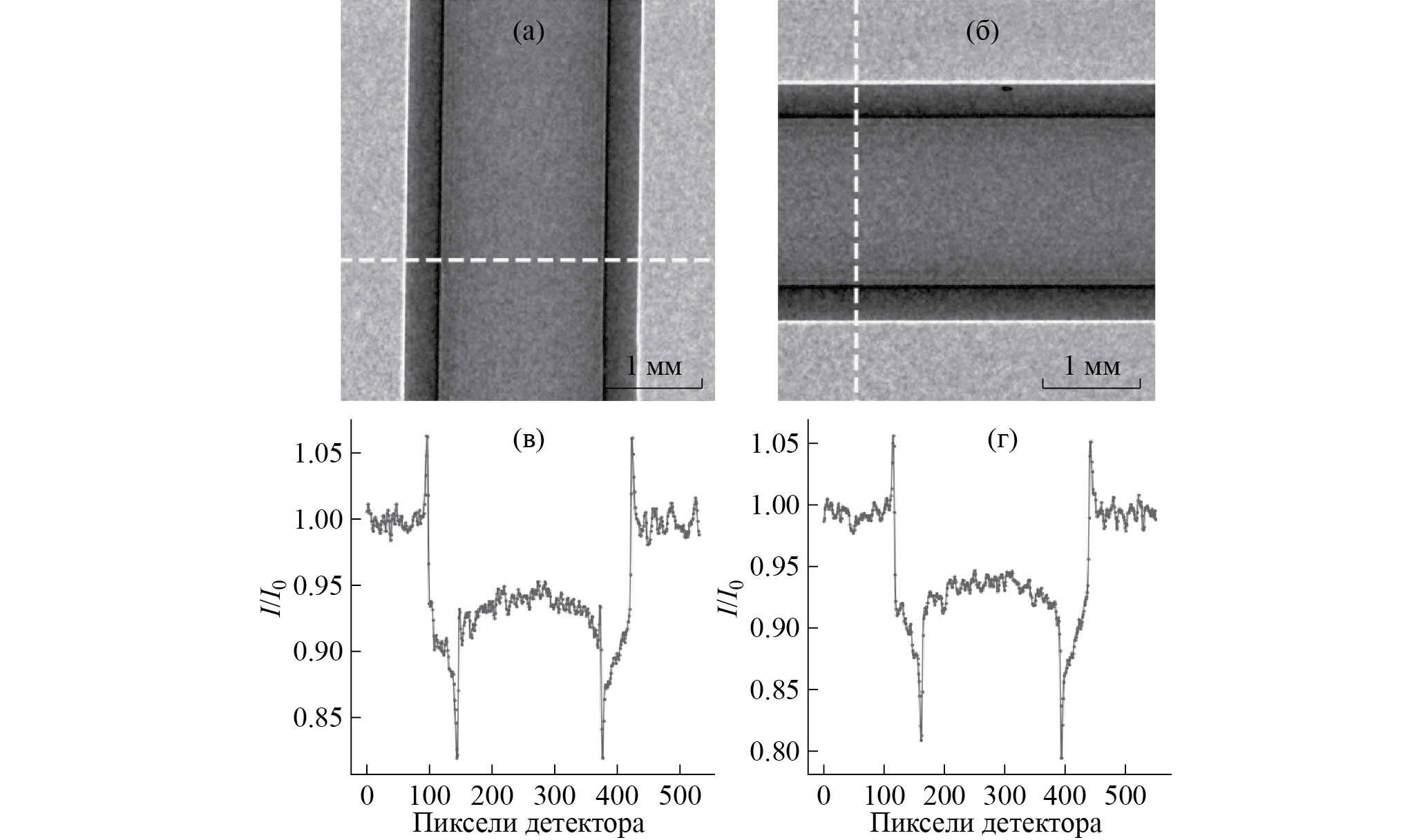 Для проверки возможности получения фазового контраста в предложенной экспериментальной схеме измерены рентгеновские проекции тестового объекта, в качестве которого использовали полиэтиленовый капилляр с внешним диаметром 2.4 мм и внутренним диаметром 1.7 мм. Фазоконтрастные нормированные проекции полиэтиленового капилляра, измеренные в вертикальном и горизонтальном положениях, представлены на рис. 7а, 7б. Нормировку проекций проводили на первичный пучок, измеренный в отсутствие образца. Профили интенсивности вдоль пунктирных линий (рис. 7в, 7г) демонстрируют скачки интенсивности на границах полиэтилен–воздух, что визуально выражается в подчеркивании границ объекта светлыми и темными контурами.