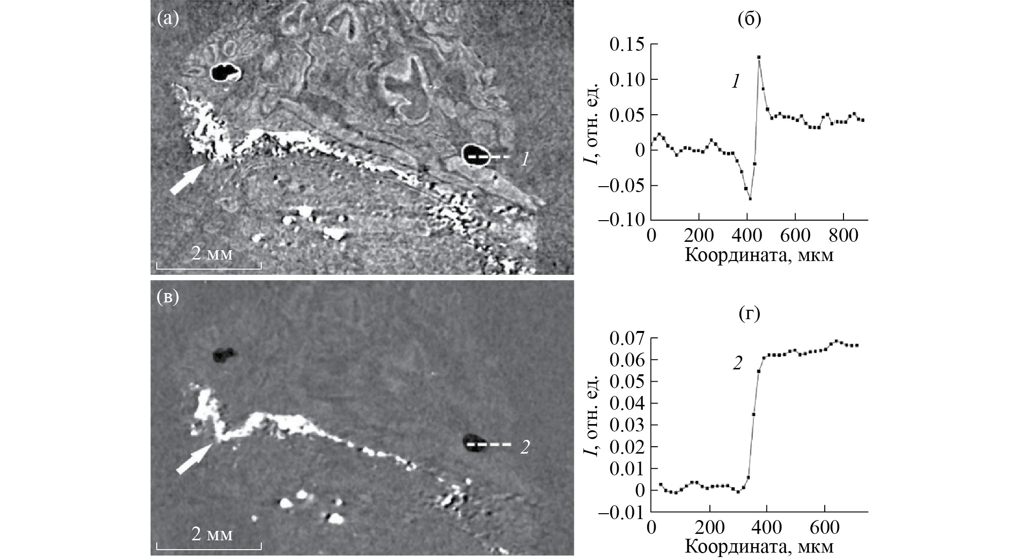 На рис. 8а и 8в представлены продольные сечения исследуемого образца, сделанные по восстановленным томографическим изображениям для измерений в фазоконтрастном и абсорбционном режимах. С целью продемонстрировать эффект фазового контраста построены профили восстановленных значений интенсивностей в градациях серого на границе воздушных пор, оставшихся в парафине при подготовке образца. Профиль вдоль линии 1 (рис. 8б) имеет характерный для фазового контраста скачок на границе. Данный эффект визуально выражается в подчеркивании границы воздух–парафин темными и светлыми контурами. В случае томографического изображения, измеренного в режиме абсорбционного контраста, визуально не наблюдается подчеркивания границы воздух–парафин, и профиль интенсивности на рис. 8г, построенный вдоль линии 2, имеет характерную ступенчатую форму. Можно констатировать, что на абсорбционном томографическом изображении (рис. 8в) наблюдаются лишь слабо заметные контуры образца эпифиза на фоне парафина. Напротив, на фазоконтрастном изображении (рис. 8а) отчетливо проявляется морфологическая структура мягких тканей эпифиза, в частности видны кровеносные сосуды. Многочисленные кальцификаты, обнаруженные в эпифизе, хорошо просматриваются как на абсорбционном, так и на фазоконтрастном томографических сечениях.