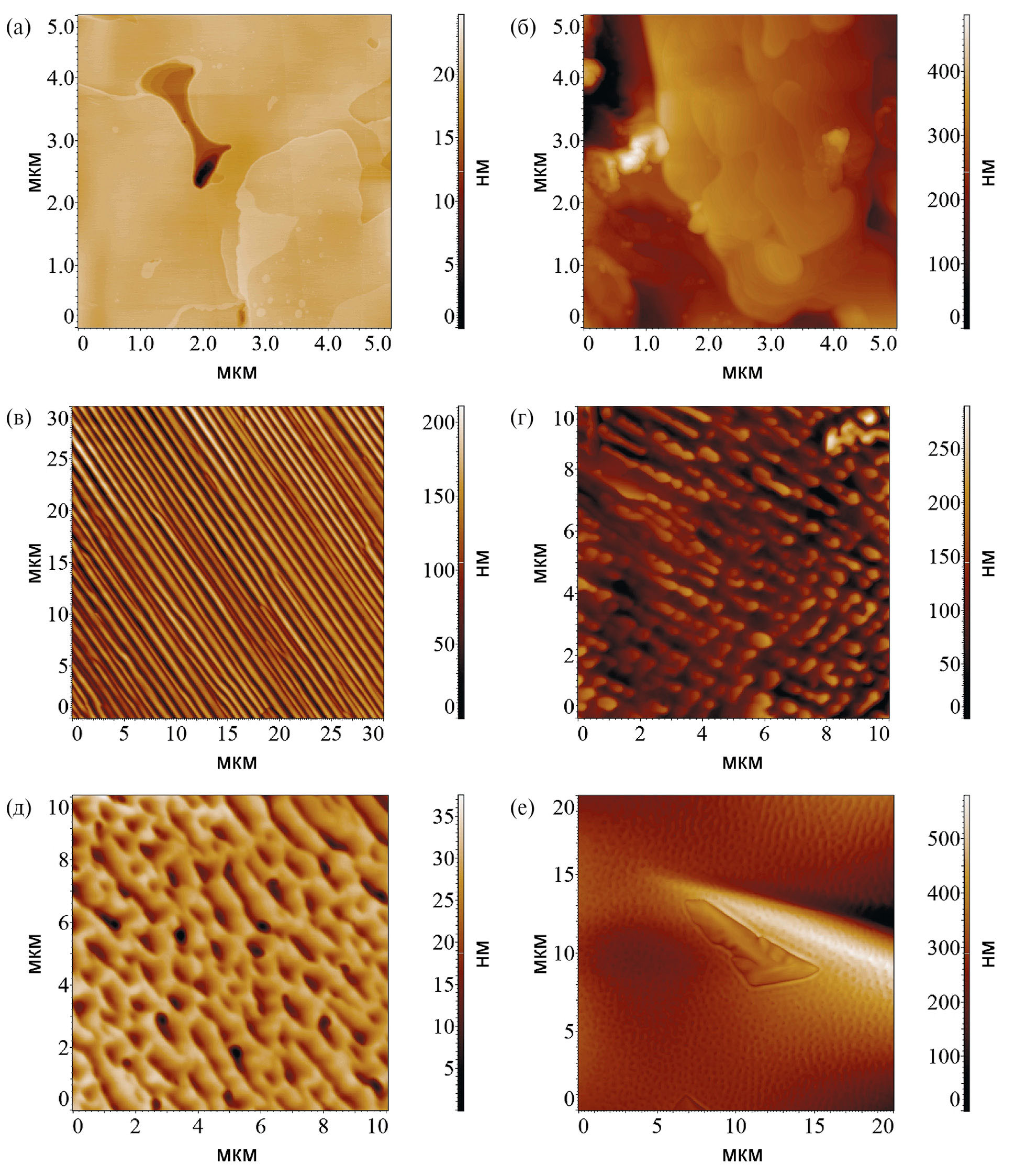 Рис. 3. АСМ-изображения поверхности образцов Cs3(HSO4)2(H2PO4) (а, в, д, е) и Cs4(HSO4)3(H2PO4) (б, г).