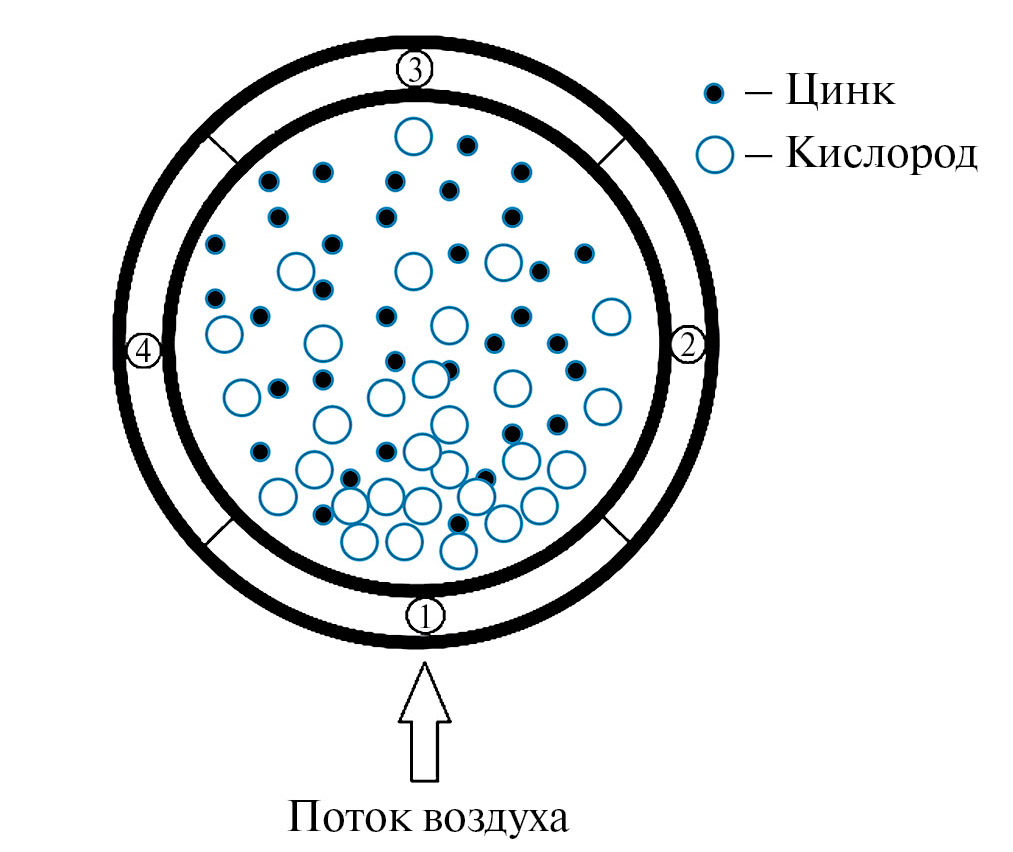Микроскопические исследования. В процессе синтеза на верхней поверхности тигля формируется толстый равномерный слой оксида цинка, состоящий из разноразмерных тетраподов с различной геометрией. После отделения синтезированного материала от стенок тигля были выделены четыре зоны (рис. 1) по отношению к окну для притока воздуха (источника кислорода) с приблизительно однородными тетраподами. Деление пространства тигля на “зоны” – условное, сообразно его геометрии и возможной определенной симметрии поступления в него потока воздуха. Особенностями условий синтеза являлись почти однородное заполнение тигля парами цинка и неоднородное заполнение парами кислорода из-за постоянного притока воздуха через окно в зоне 1.