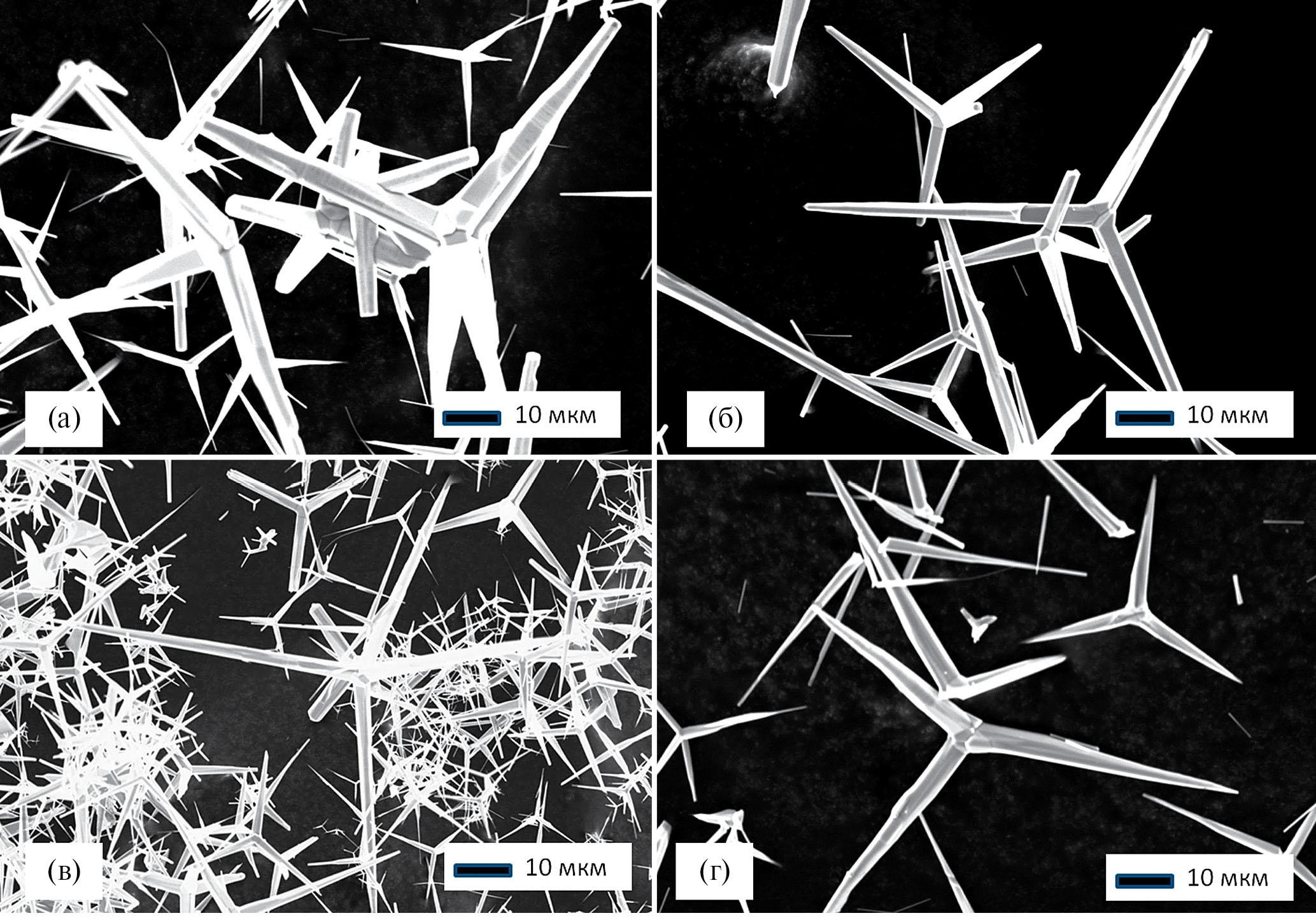 В зоне 1 (рис. 2а), расположенной ближе всего к источнику кислорода, росли самые крупные, хорошо сформированные тетраподы, где четыре гексагональных острия вюрцита выходят из центральной оцинкованной сердцевины [12]. Результаты синтеза в зонах 2 (рис. 2б) и 4 (рис. 2г) морфологически идентичны с зоной 1, однако наблюдается уменьшение размеров тетраподов (примерно в 1.5 раза), связанное с уменьшением концентрации кислорода. Самые мелкие тетраподы с тонкими игольчатыми стержнями образуются в зоне 3 (рис. 2в), наиболее удаленной от источника кислорода; соотношение линейных размеров образцов в зонах 3 и 1 ~ 1/5.